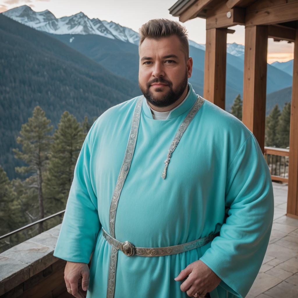 Portrait of a curvy man with a faux hawk hairstyle wearing an aqua cashmere robe over a matching priest outfit. He accessorizes with a silver cross necklace and a watch, standing on a stone porch with wooden roof beams, overlooking a mountainous forest landscape under soft, pastel lighting.