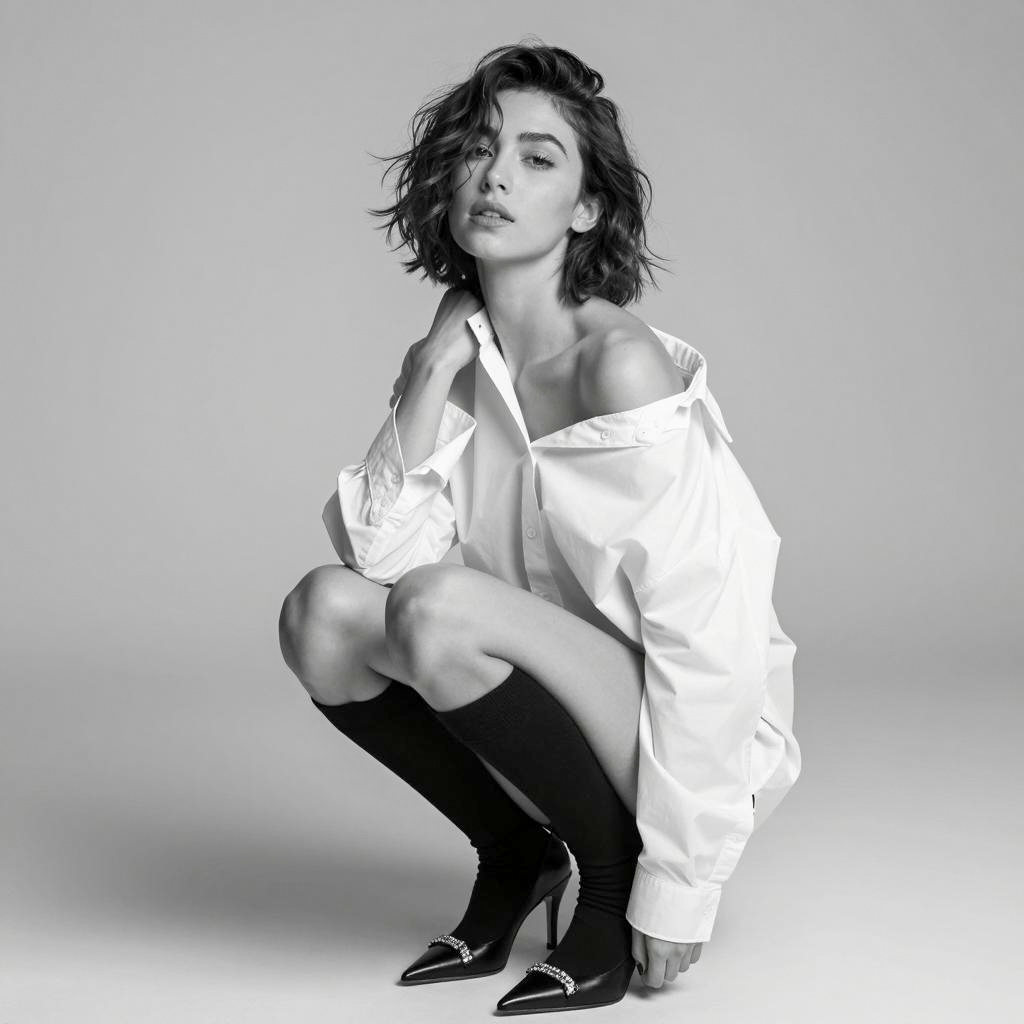 Black-and-white photo of a woman with short, curly hair, wearing a long leather coat, black thigh-high stockings, and black heels. She is crouching with one knee up, her hand resting on her cheek, and her eyes looking to the side. Her expression is intense and contemplative. The background is a plain, light grey.
