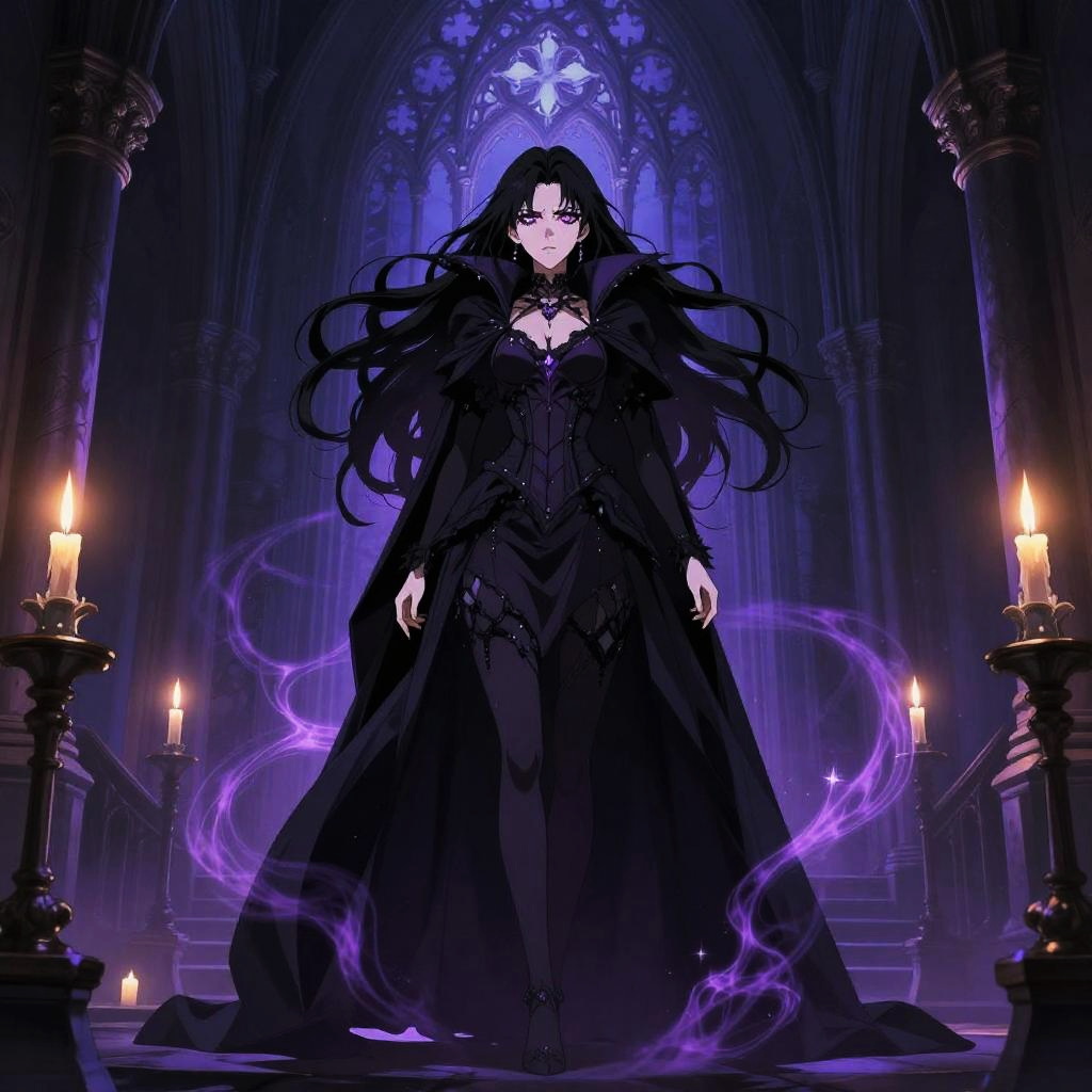 Anime gothic fantasy setting showcasing a dark sorceress, elaborate gothic cathedral architecture, candles flickering in the shadows, purple and black color palette with ethereal magical effects