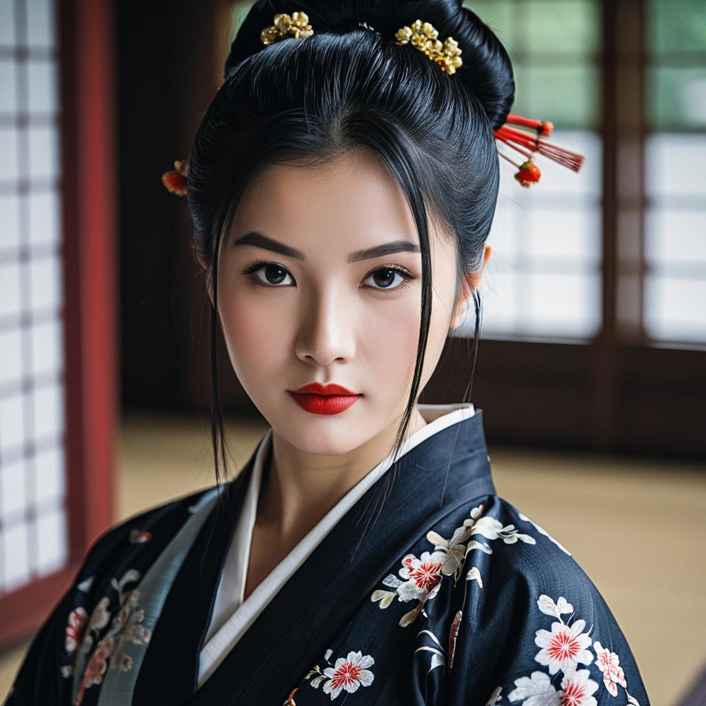 Hanfu female,1girl, solo, realistic, black hair, japanese clothes, looking at viewer, kimono, hair ornament, upper body, blurry, hair bun, blurry background, asian, black eyes, lips, single hair bun