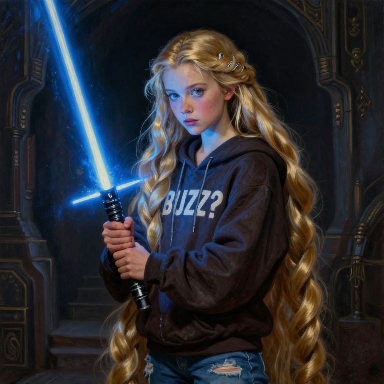 An ultra-detailed, portrait oil painting of a young Jedi Rapunzel, emanating calm and wisdom, holding a blue lightsaber, its blue blade illuminating her face, Her expression is determined and focused, She is inside an ancient Jedi temple shrouded in darkness, where the only light comes from her glowing blue lightsaber, The Jedi Rapunzel is skinny barely in her teens, Her long, iconic blond hair cascades in wild, untamed waves, She is wearing an oversized, dark colored hoodie with bold typography that reads \"BUZZ?\" in white letters and ripped blue jeans, Oil painting, Focus on the girl, shadow and light, intricate lines, intriguing atmosphere, sharp magnificent details, delicate features, elaborate details, 2\3 rule composition, romantic, Rembrandt lighting, brush stroke, lovely, novuschroma, in the style of Rembrandt, vantablack