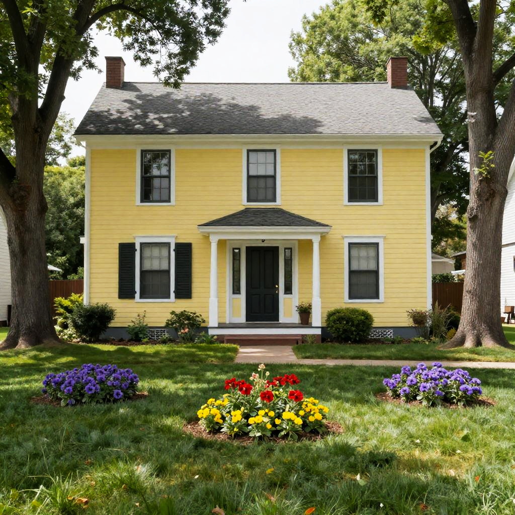 Yellow two-story house with white trim, gray shingle roof, and a small porch. Well-maintained front yard with three flower beds in the foreground, containing purple, red, and yellow flowers. Two tall trees on either side, casting shadows on the lawn. Bright sunlight illuminates the scene.