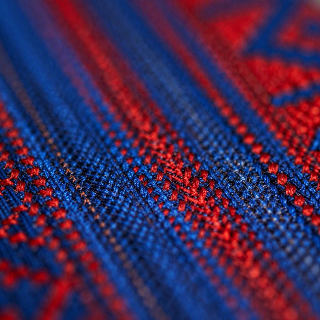 Abstract close-up of tapicerki textile texture, intricate weave patterns, vibrant shades of blue and red, glowing highlights, ultra detailed macro shot, artistic focus on fabric properties, modern digital art style