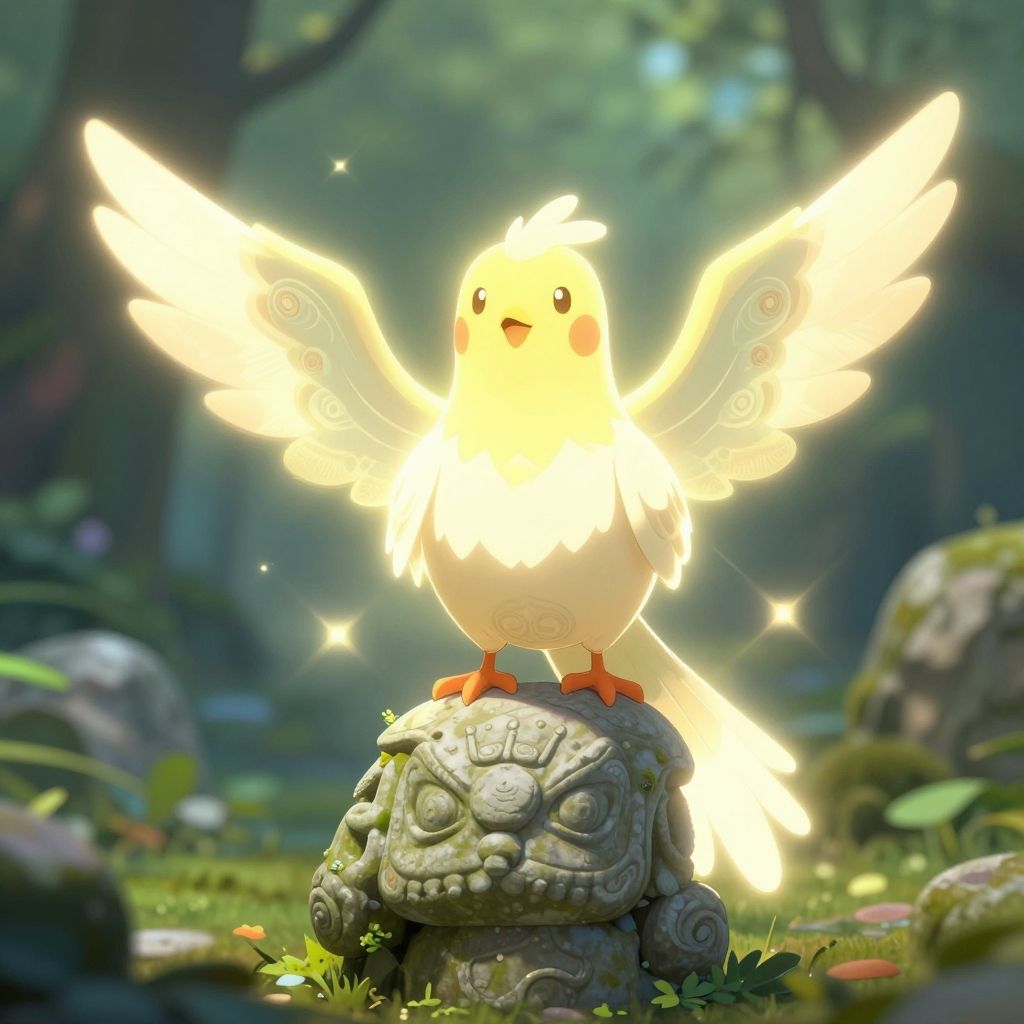 A vibrant, digital illustration features a glowing, cartoon-style, white bird with yellow wings and red cheeks, standing on a detailed stone pedestal. The bird has bright, radiant wings spread wide, emitting light and sparkles. The background is a lush, green forest with blurred trees and rocks, creating a mystical atmosphere. The stone pedestal has intricate carvings and moss, adding texture. The bird's small, orange feet grip the pedestal, and its round eyes and open beak convey a cheerful expression. The overall style is whimsical and magical, with a focus on bright, contrasting colors and soft, glowing effects.