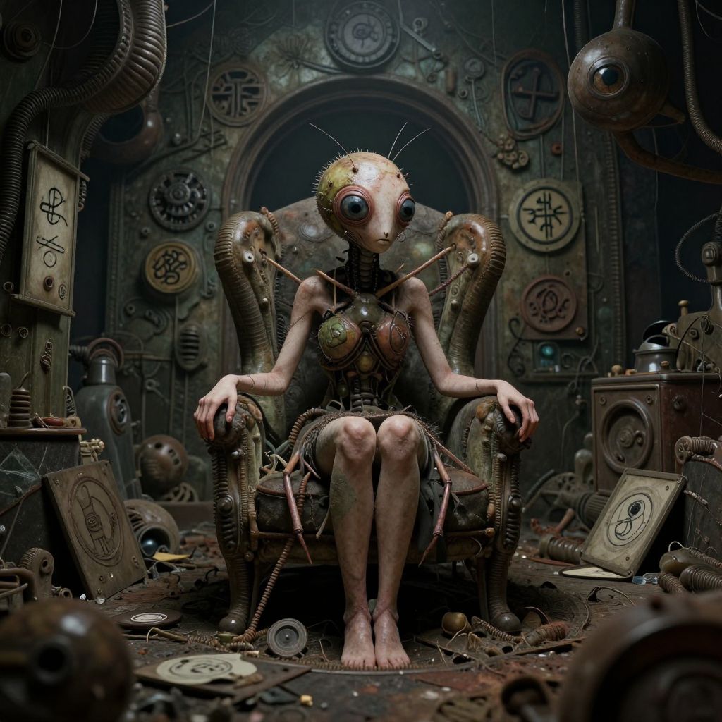 This is a digital artwork depicting a surreal, humanoid figure with insect-like features, sitting on a mechanical chair in a dark, steampunk-inspired room. The figure has large, round, expressive eyes, a yellow, textured exoskeleton head, and multiple mechanical arms. It is dressed in a metallic chest plate and a tattered skirt, with bare, pale legs. The background is cluttered with various steampunk machinery, including gears, pipes, and circular devices, creating a sense of a dystopian, industrial environment. The lighting is dim, casting shadows and highlighting the intricate details of the mechanical elements and the figure's unusual form.