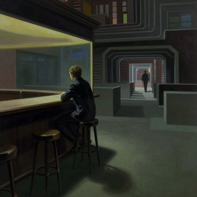 An image in an enigmatic style, reminiscent of both Hopper's quiet introspection and Khan's layered depth, portrays a solitary figure at a dimly lit bar from a low-angle perspective. The scene reveals a network of shadowy tunnels beneath the table legs, extending into a labyrinthine city underworld. Muted tones with soft neon light cast elongated shadows that merge with the maze-like passageways, evoking solitude, contemplation, and an ethereal connection between humanity and its urban environment.