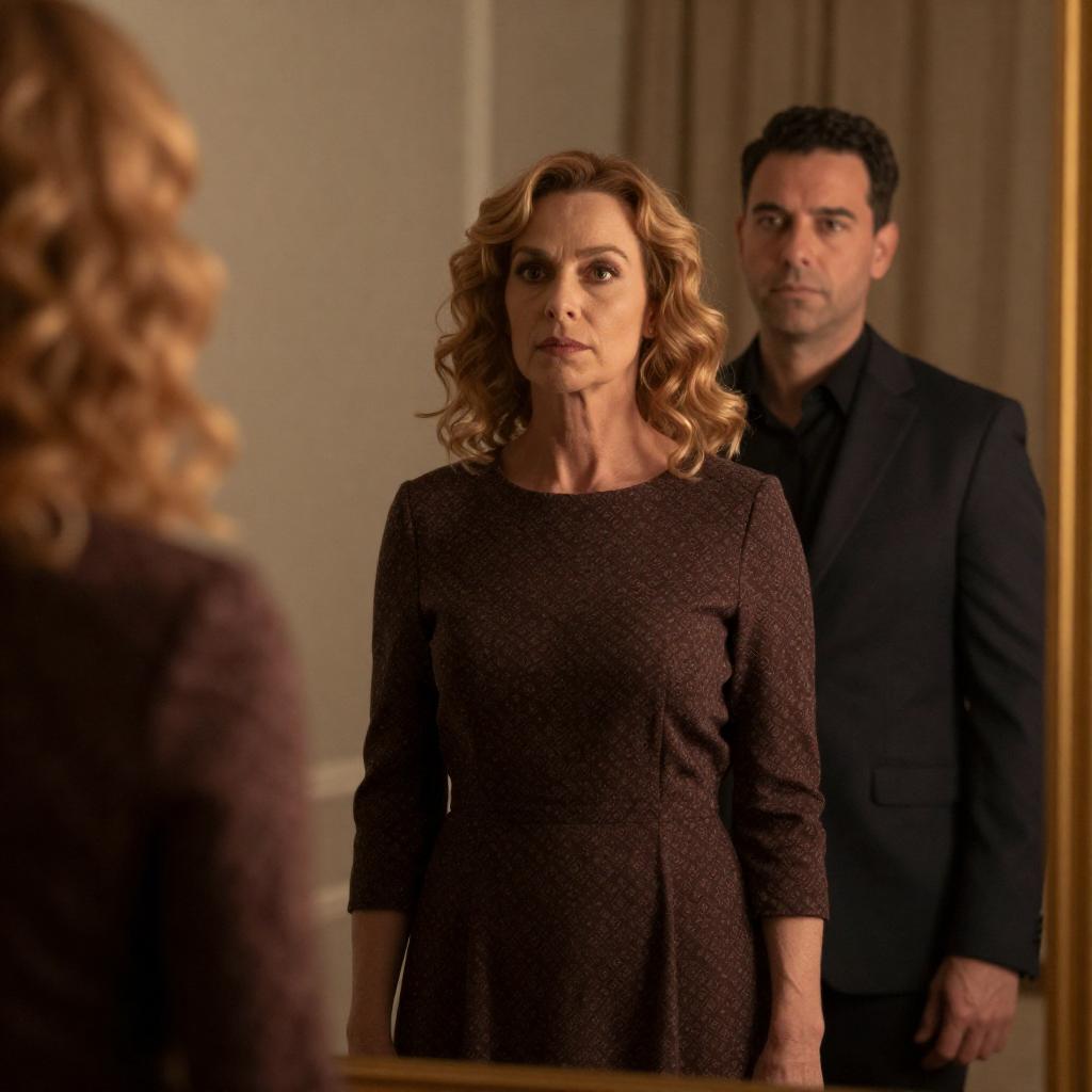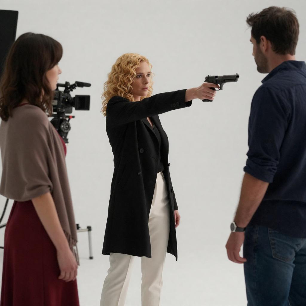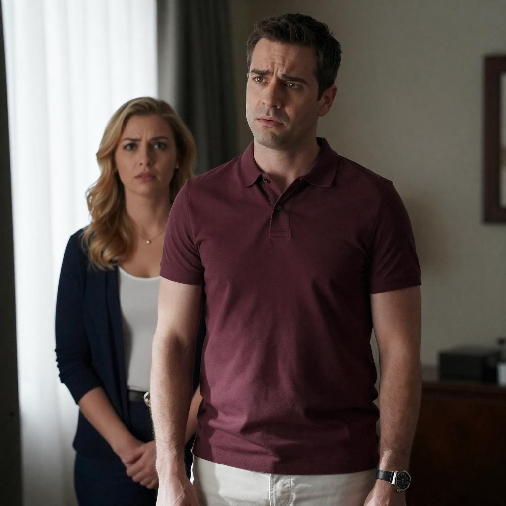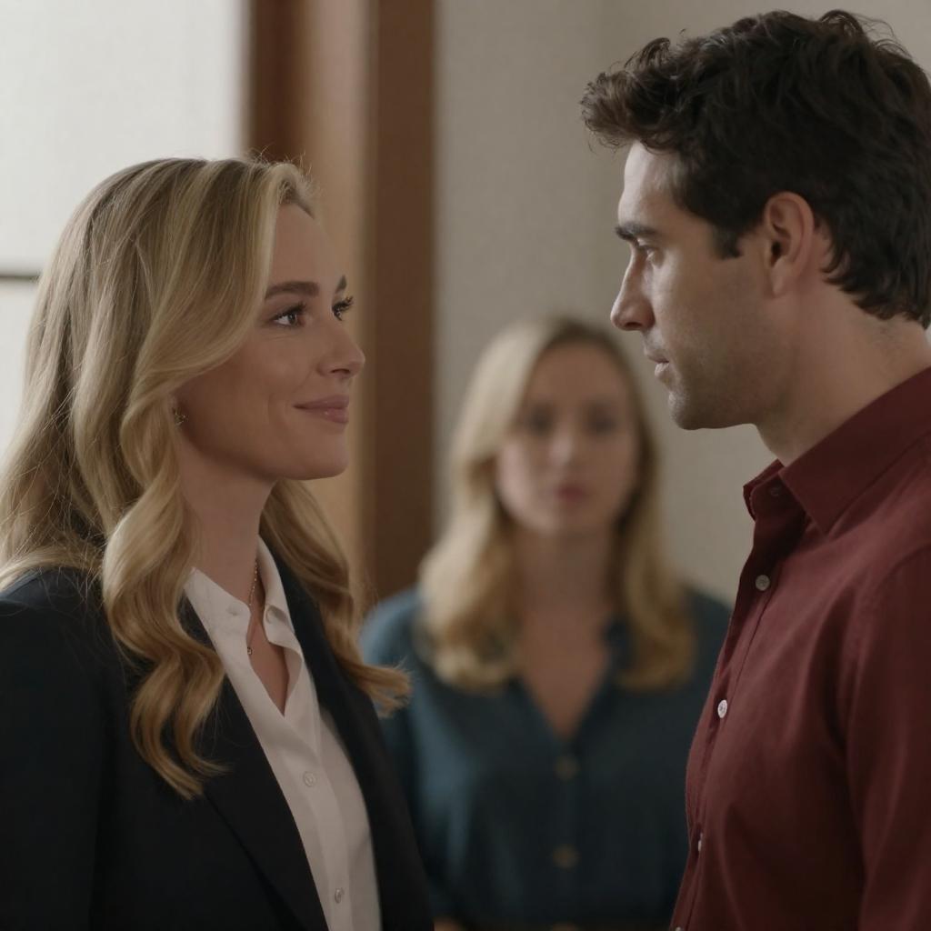 Photograph of three people in an indoor setting with a brick wall and wooden staircase. A muscular man with dark hair in blue scrubs holds a red bag, looking down at a woman with curly blonde hair and sunglasses, wearing a beige shawl. A blonde woman in a black blazer and red dress stands to the right, looking at the man.