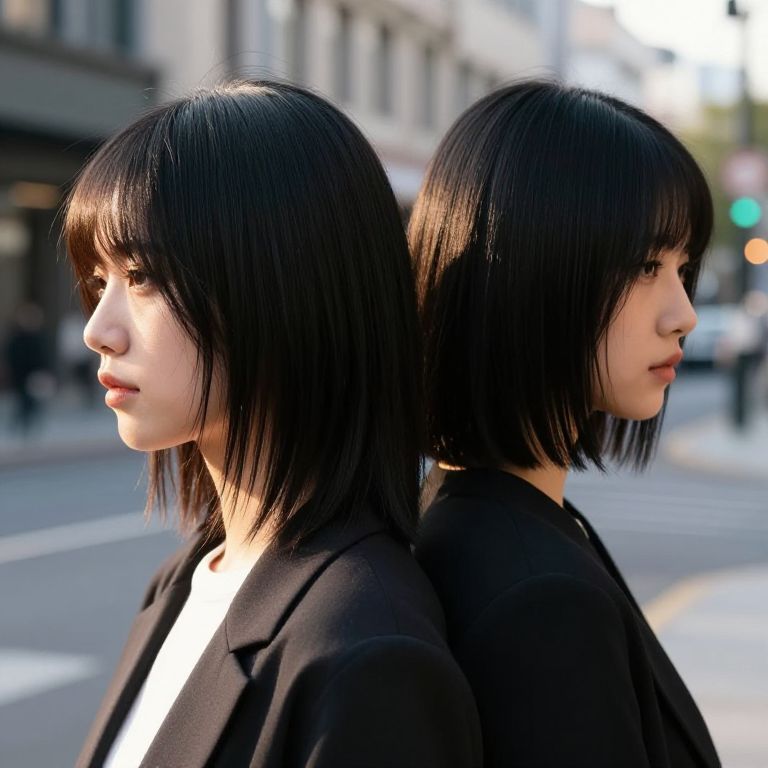 Two block haircut girl with sleek black hair, soft sunlight highlighting the layers, urban street background, modern fashion style, cinematic lighting