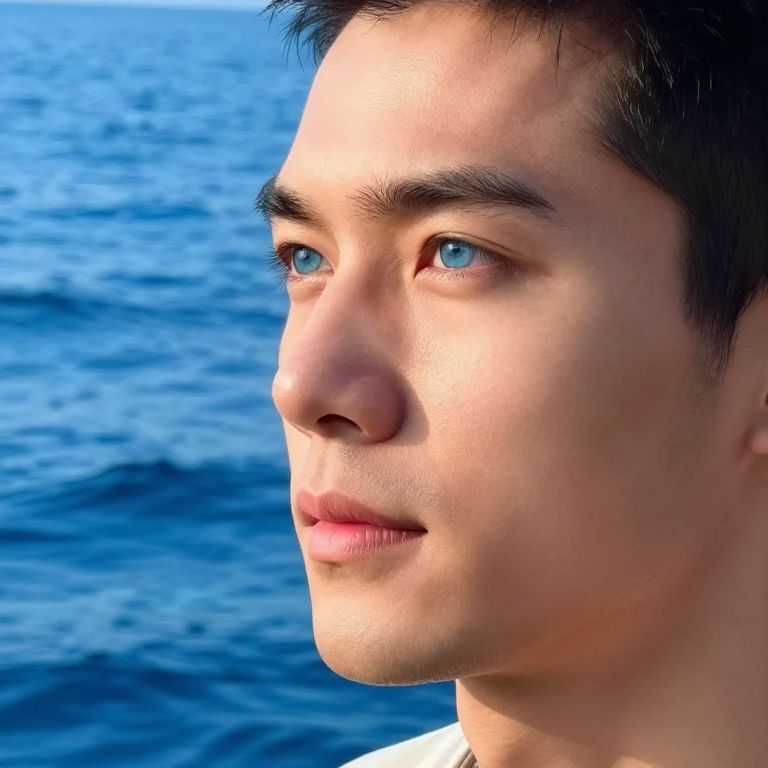A photorealistic portrait captures a subject's enigmatic stare, their piercing sapphire eyes illuminated by the warm glow of a setting sun filtering through autumn leaves. The close-up focus draws viewers into an intimate scene as the individual's expression shifts from introspection to warmth and understanding, evoking a powerful emotional journey that seamlessly blends vulnerability with strength.