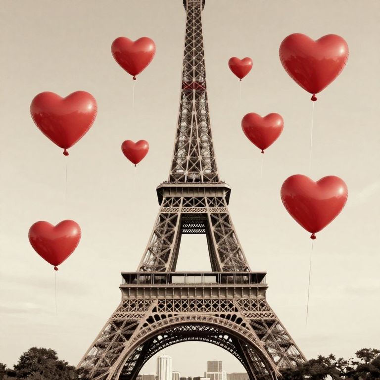 Eiffel Tower stands majestically against a soft, sepia-toned sky, surrounded by a whimsical array of floating red heart-shaped balloons that drift gracefully around its iconic structure, evoking themes of love and romance in a vintage-inspired collage.
