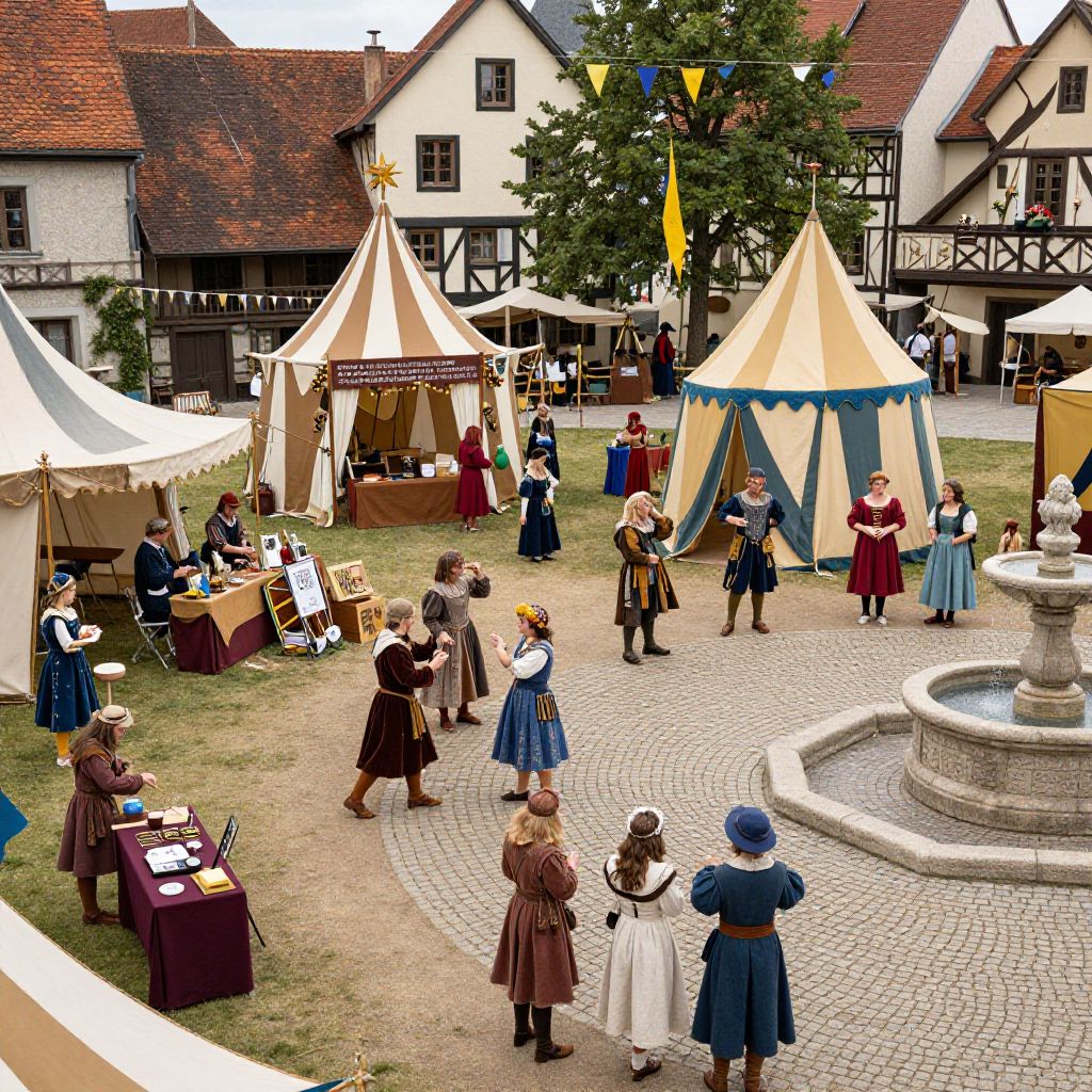 1678 Renaissance festival scene, bustling town square with musicians, dancers, and artisans, colorful tents and flags fluttering, people in elaborate period costumes engaging in crafts and games, cobblestone paths and stone fountains, warm and festive mood