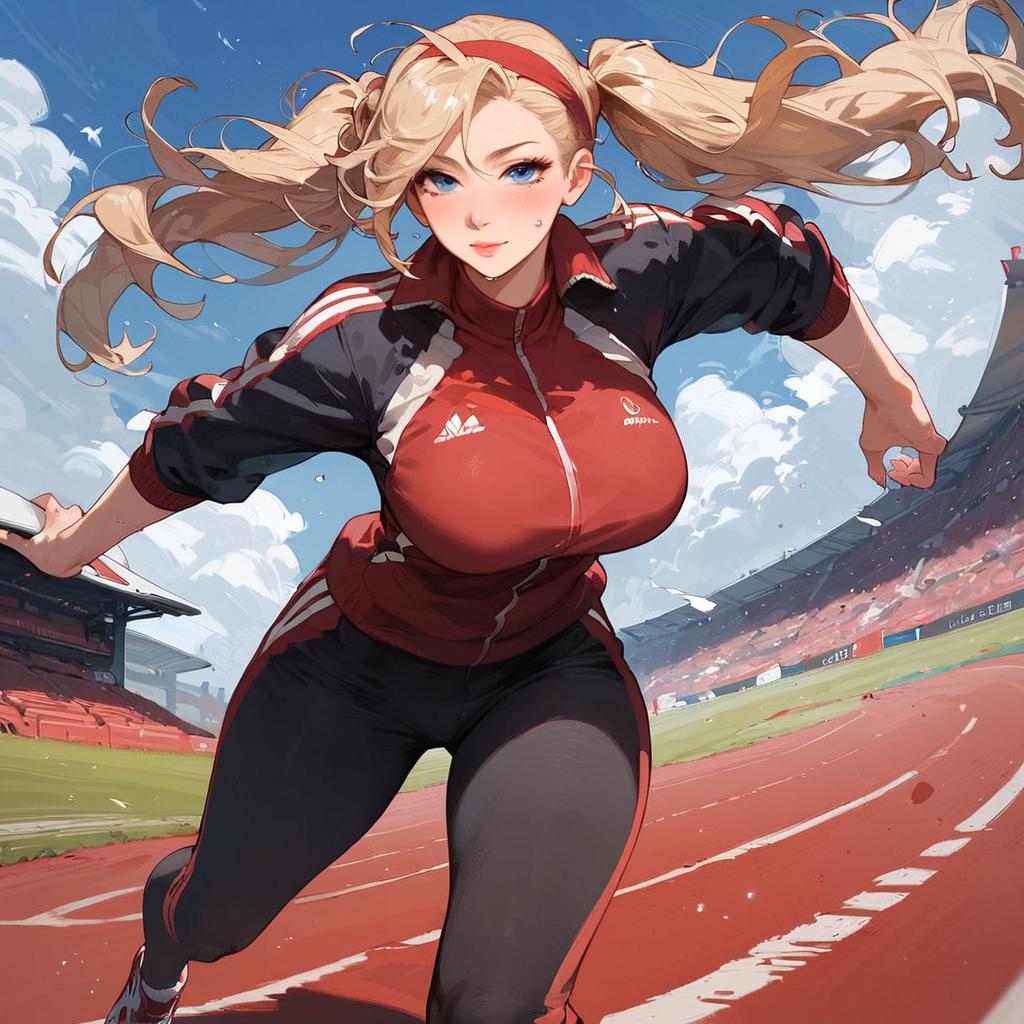 Score_9, score_8_up, score_7_up, score_6_up, source_anime, 1girl, blonde hair, twintails, large breasts, red track jacket, red track pants, running, sweat, headband, track and field, blue sky