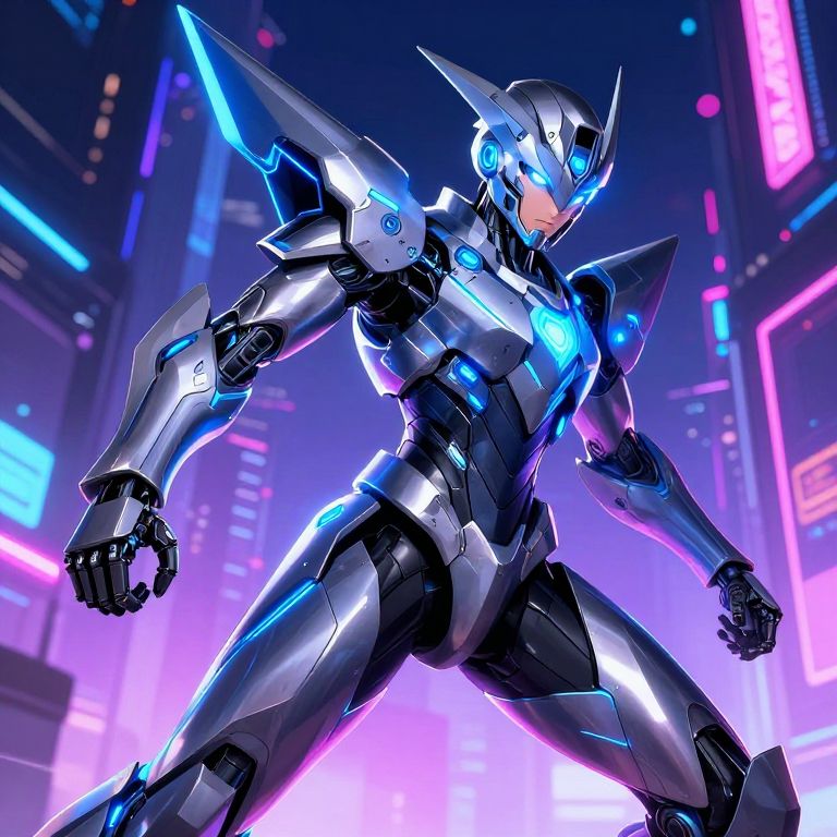 Futuristic anime armor designed for a cybernetic warrior, sleek metallic plates with glowing neon blue accents, integrated high-tech weaponry, dynamic pose in a dystopian cityscape under neon lights, sharp angular design, vibrant color palette