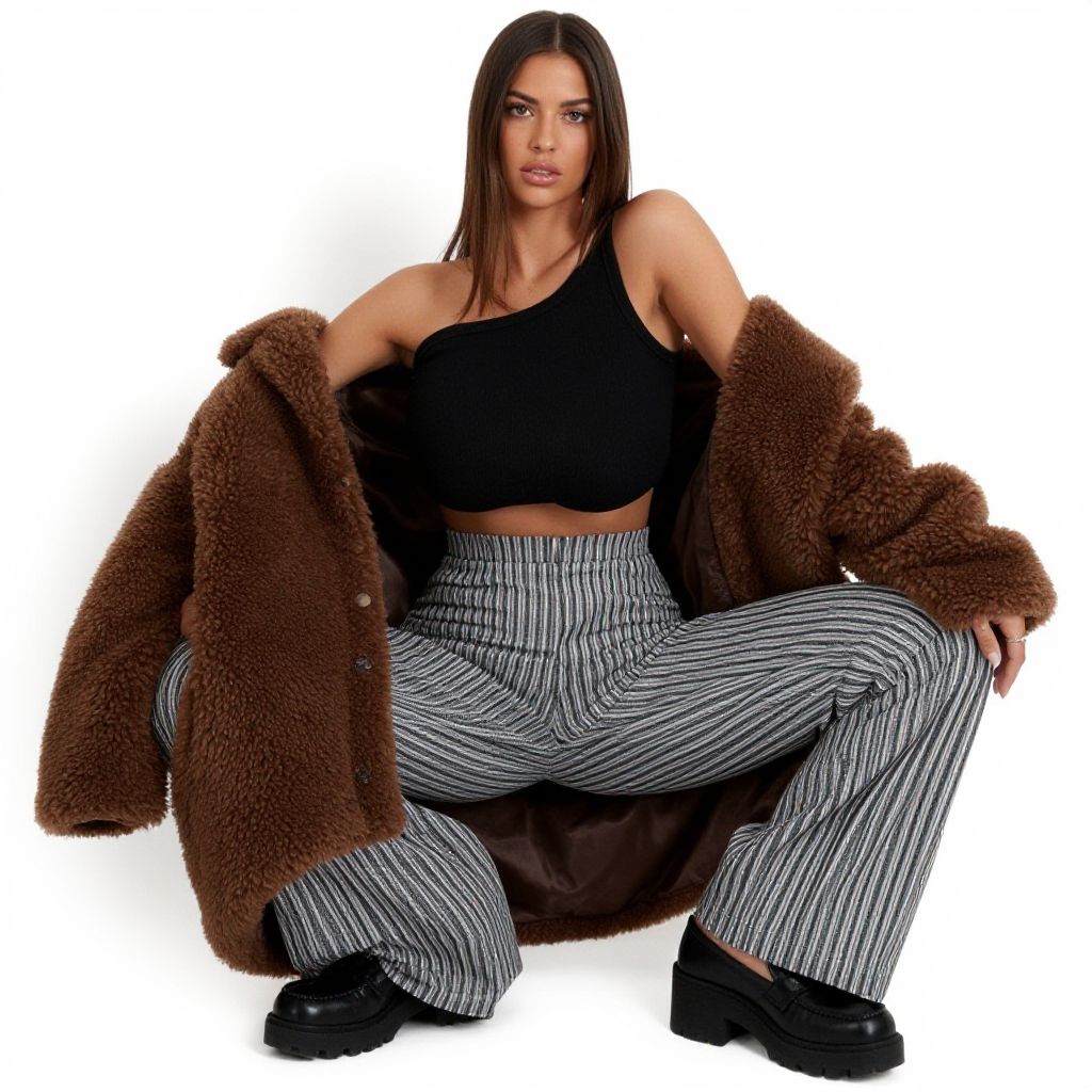 "Woman, casual streetwear, black cropped tank top, high-waisted pants with vertical black and white stripes, relaxed fit, chunky black loafers, oversized brown teddy jacket, half on, white background.. Sexy. Pretty face and beаutiful eyes. Big breasts."