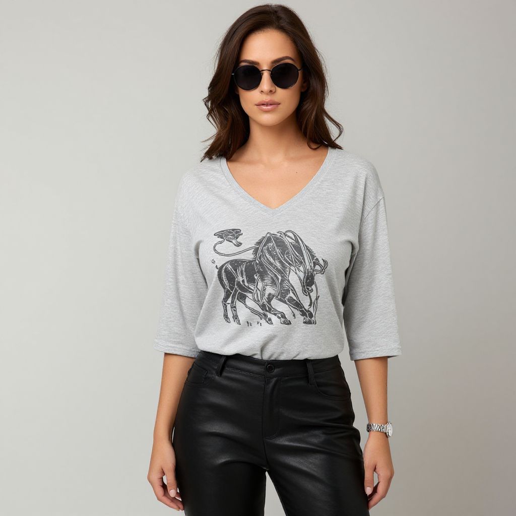 "Woman, casual chic, loose-fitting grey V-neck T-shirt with a graphic print, three-quarter length sleeves, black faux leather pants with a snug fit, dark round sunglasses, slim silver wristwatch.. Sexy. Pretty face and beаutiful eyes. Big breasts."