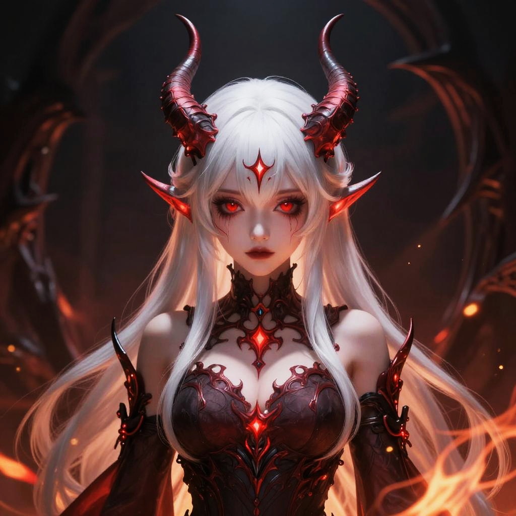 Demon eyeliner design illustrated on a surreal demon character, intense black eyeliner with fiery red glows, mythical aura, detailed sharp edges and curves around the eyes, dark fantasy theme, mystical atmosphere, otherworldly makeup artistry with dramatic effects