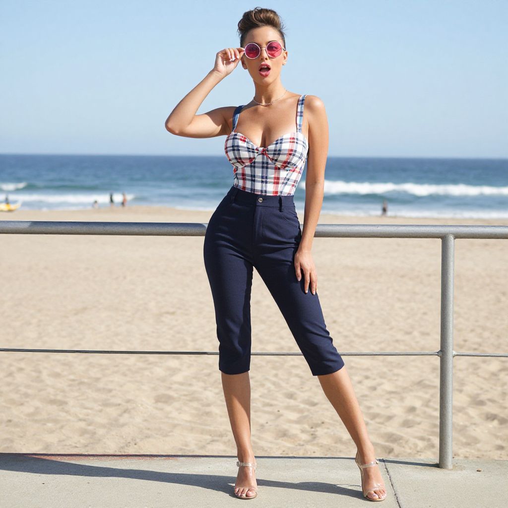 A Slim woman, in a retro-inspired plaid bustier and high-waisted capri pants, wearing clear strap sandals and round pink-tinted sunglasses, enjoying a sunny day at the Fashionable boardwalk in Long Beach, playfully posing for a photo with the ocean in the background, in a cinecolor style. Sexy. Pretty face and beаutiful eyes. Big breasts