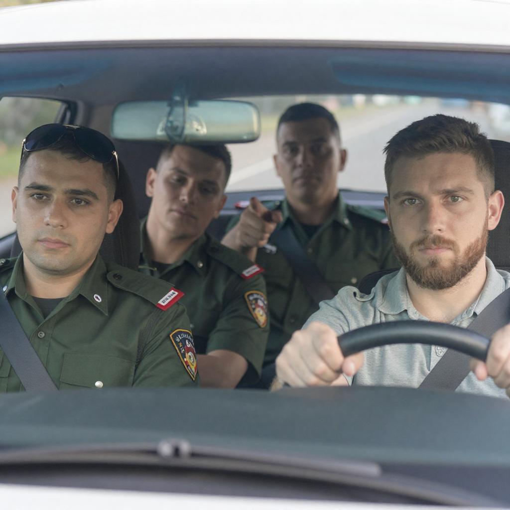 Photograph of four men in a car. Driver, right, light beard, grey shirt, hands on steering wheel, neutral expression. Two men in green uniforms, red badges, pointing, left and center. Fourth man, left, sunglasses on head, looking down. Background blurred.