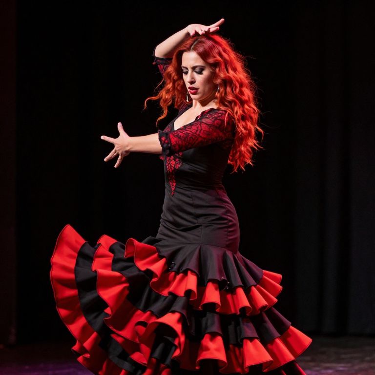 Red hair Latina dancing passionately in a flamenco dress, rich deep reds and blacks, swirling skirts, dramatic stage lighting highlighting her fiery red hair and intense emotion, traditional Spanish cultural setting, dynamic and powerful composition