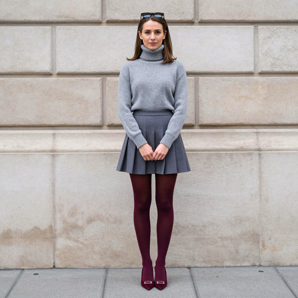 Brown-haired woman standing on sidewalk. Wearing gray knitted turtleneck, gray pleated mini skirt, maroon opaque tights, maroon pointed heels with silver details. Hands in front, fingers interlocked. Sunglasses on head. Light gray stone wall background. Overcast light.