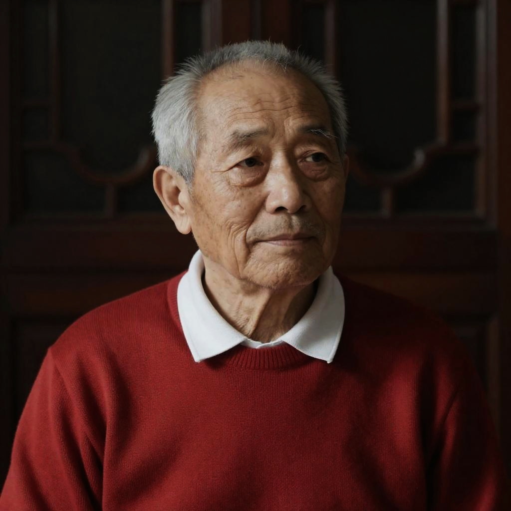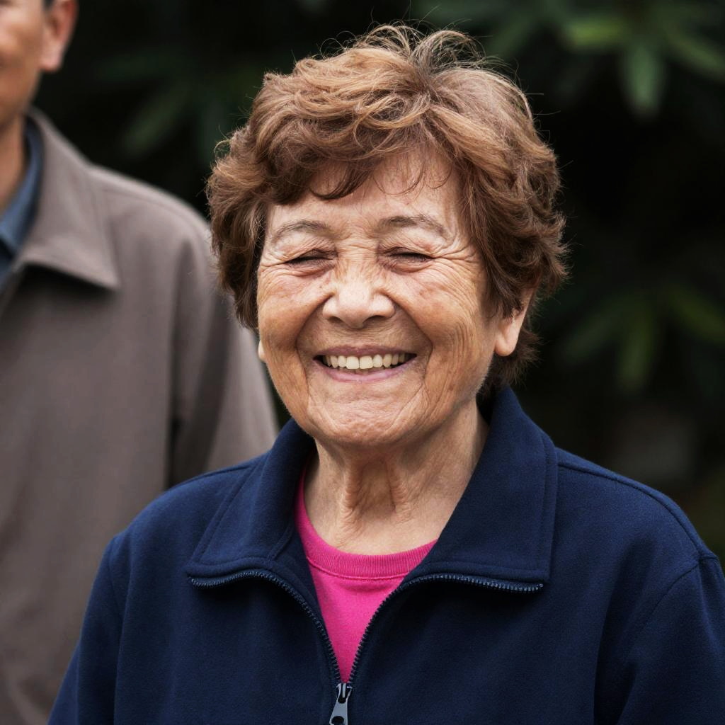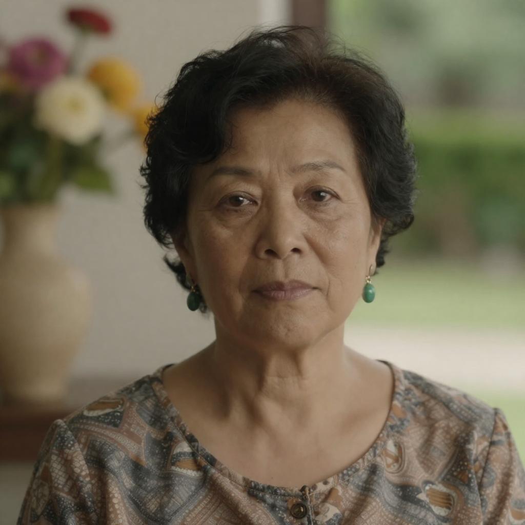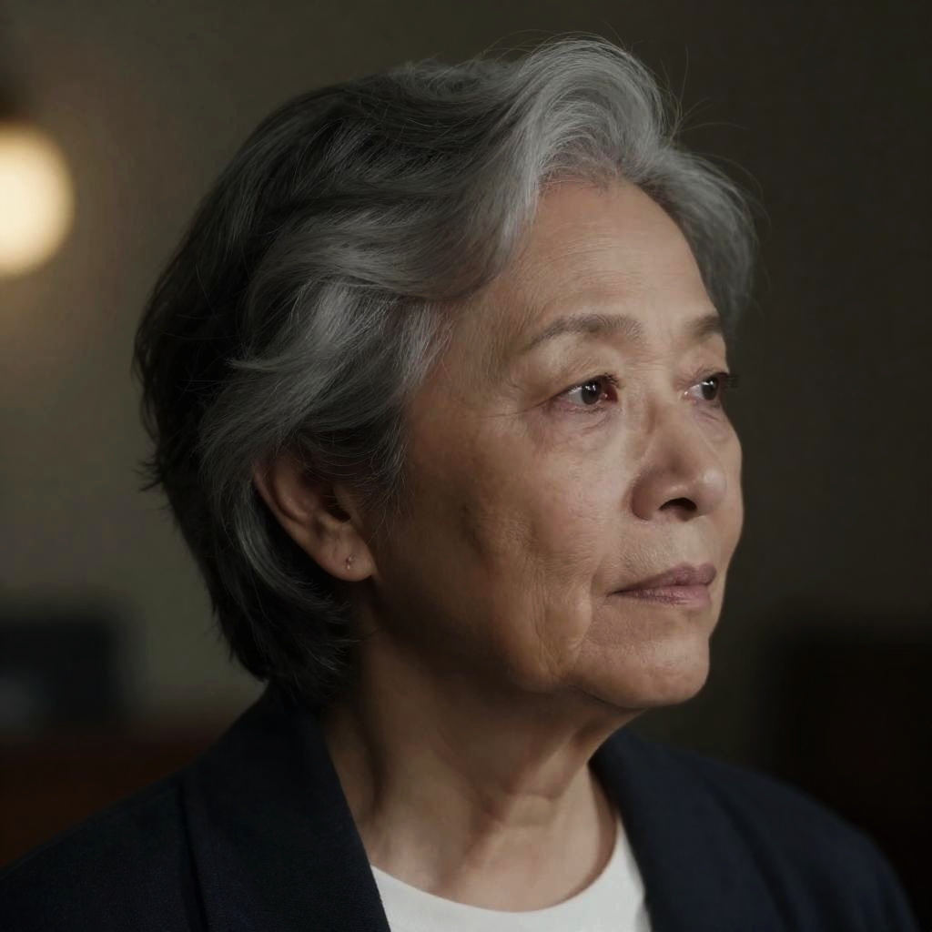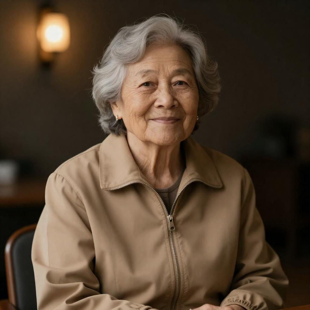 Elderly woman with gray hair, wearing a tan jacket, smiling slightly. Background is dark with a warm, blurred light source. She sits with arms resting on her lap. Soft lighting highlights her face.