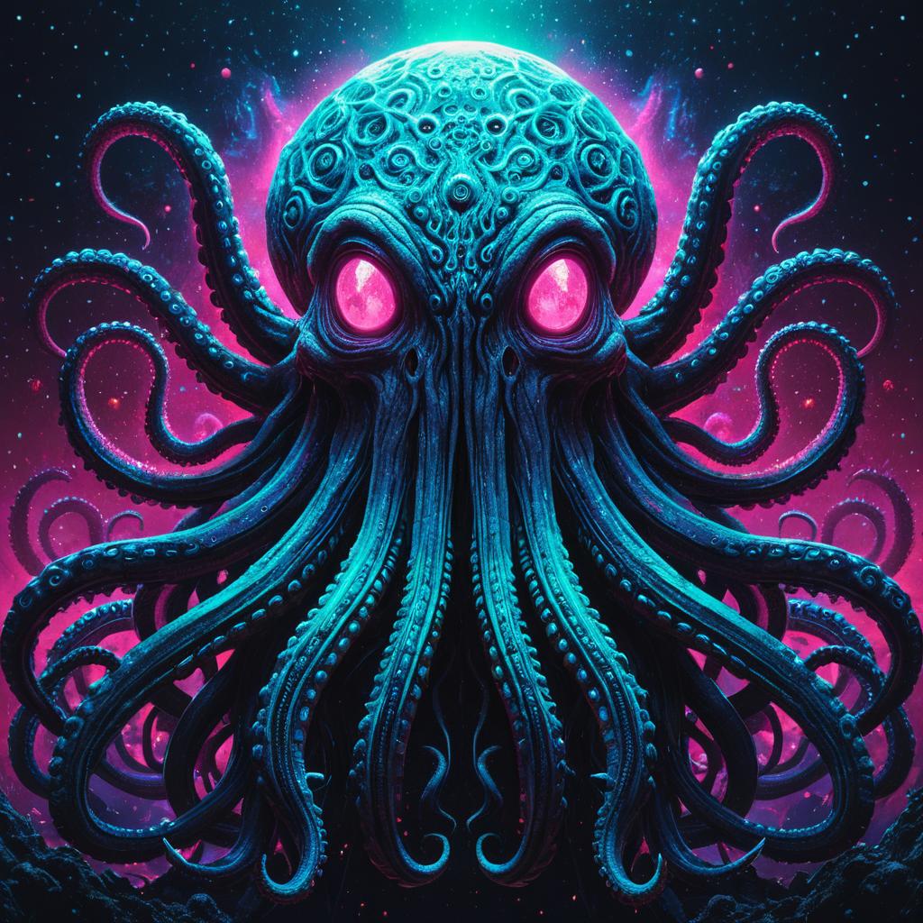 An eldritch horror, with writhing tentacles and multiple glowing eyes, emerging from an abyssal void with flickering star-like lights, surrounded by floating archaic symbols and eerie pulsating auras, depicted in the intense and nightmarish style of Kentaro Miura.