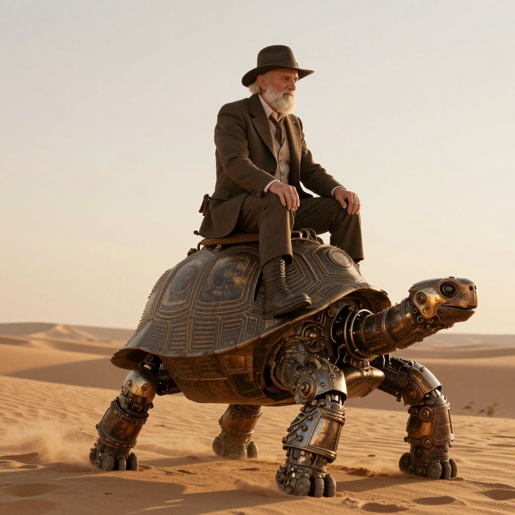 A high-definition digital illustration depicts an elderly man with a white beard, dressed in a brown suit and hat, riding a large mechanical tortoise across a desert landscape during the golden hour, symbolizing a surreal journey through time with a blend of steampunk and fantasy elements.