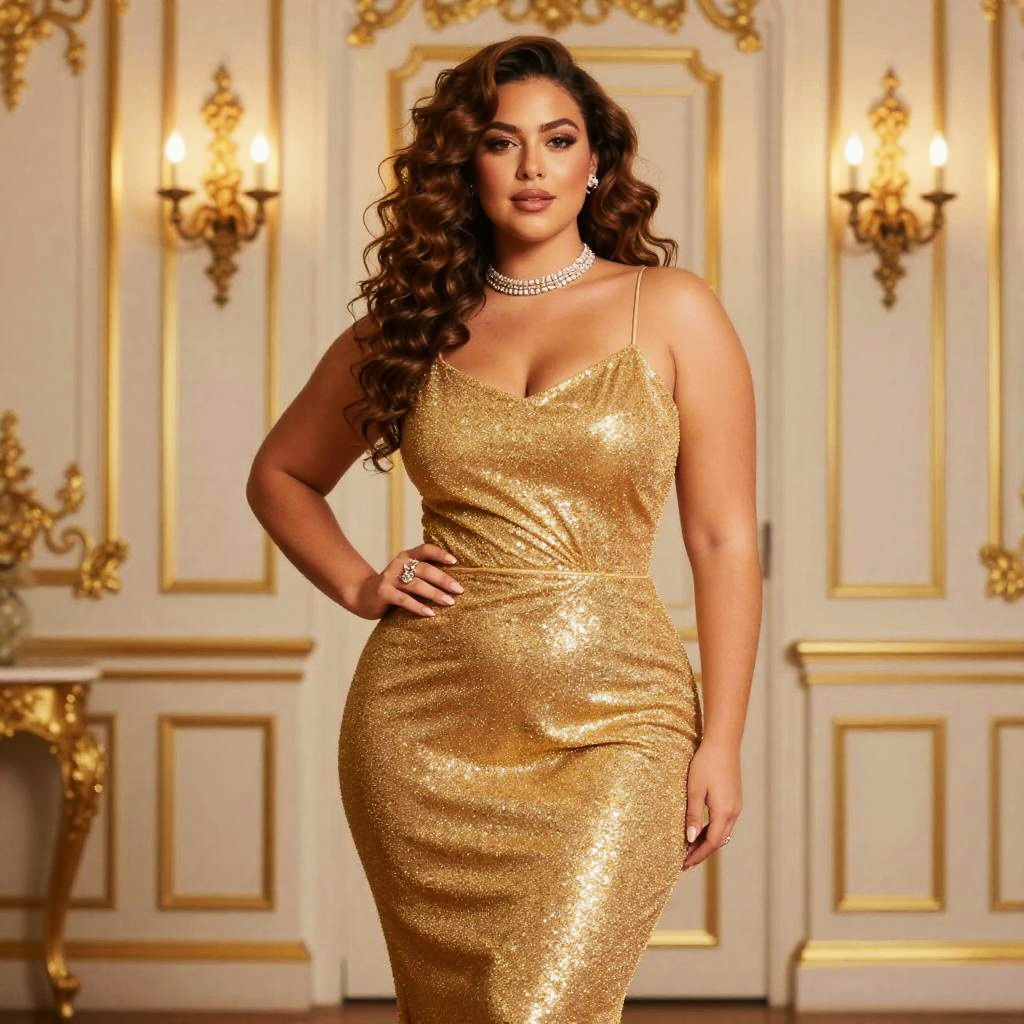 Photograph of a curvy woman with light brown skin and curly brown hair, wearing a shimmering, gold, form-fitting dress with thin straps. She's accessorized with a sparkling choker necklace and a ring on her right hand. She's standing confidently in an ornate room with white and gold wall panels, and lit sconces in the background. The lighting highlights her figure and the dress's sparkle.