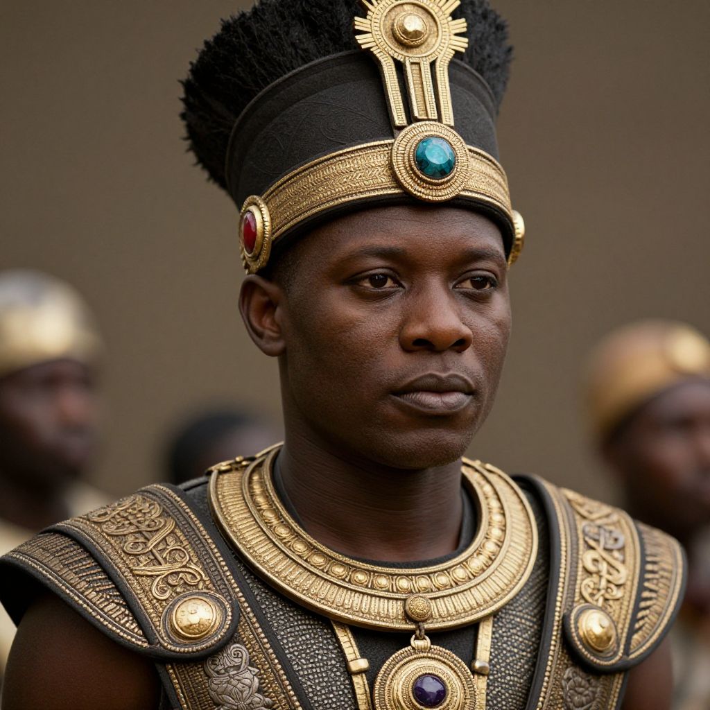 Photograph of an African man with dark skin and a tall, textured black Afro. He wears an ornate gold headdress with a blue gemstone at the center, and a matching gold necklace with intricate patterns. His black tunic is adorned with gold embellishments and circular blue gems. The background is blurred, showing other similarly dressed individuals. The man's expression is serious and focused, with a slightly furrowed brow. The lighting highlights the gold and gemstones, creating a rich, regal appearance. The photograph captures a traditional, cultural attire style.