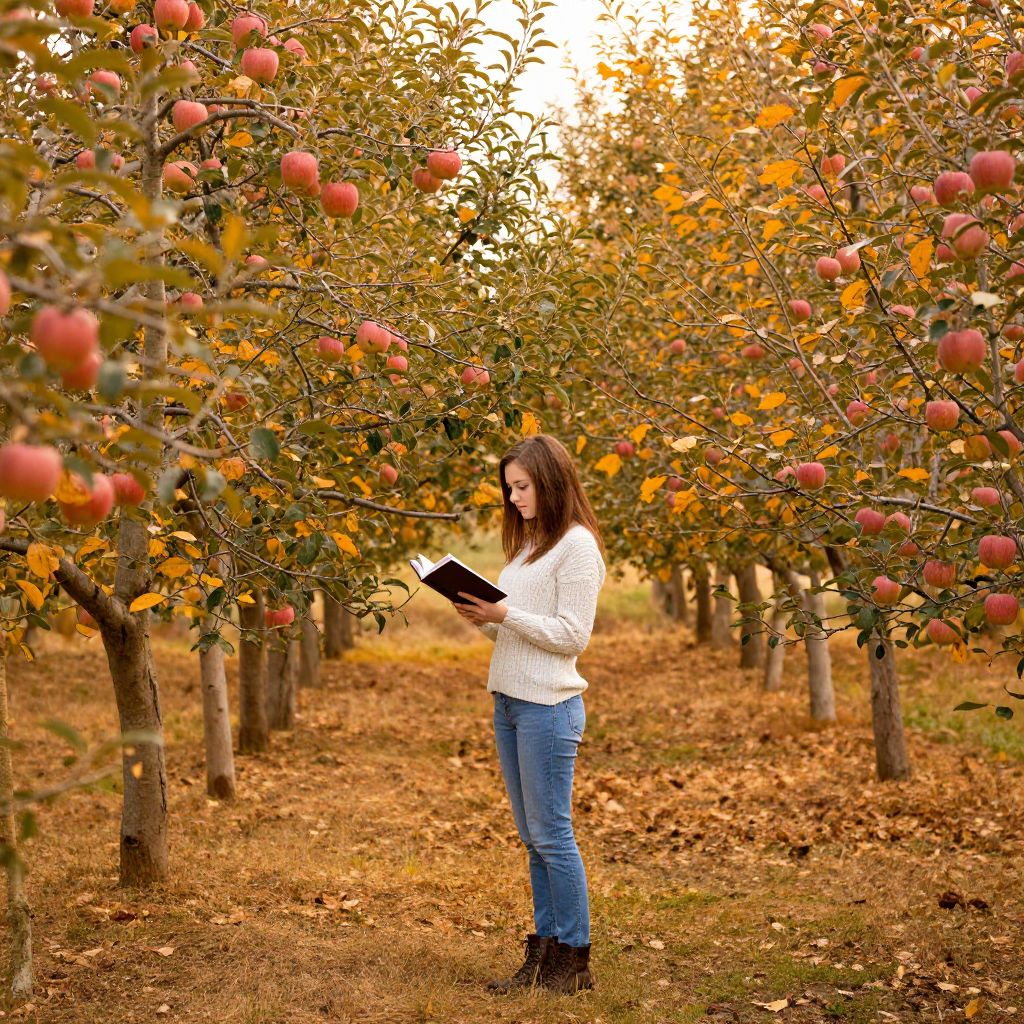 A young woman stands amidst a vibrant autumnal orchard, surrounded by trees laden with ripe red apples, while reading a book under the canopy of golden-orange foliage.