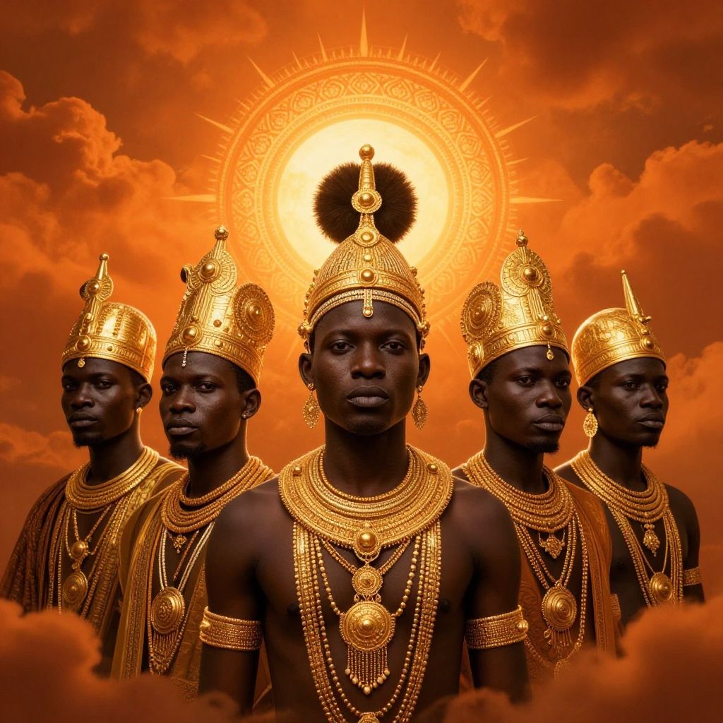 A stunning digital artwork depicting five African men adorned in elaborate golden headdresses and jewelry, standing majestically against a backdrop of dramatic orange clouds and a radiant sun halo with intricate patterns. The figures have dark skin tones and strong, serene facial features, showcasing cultural richness and regal elegance.