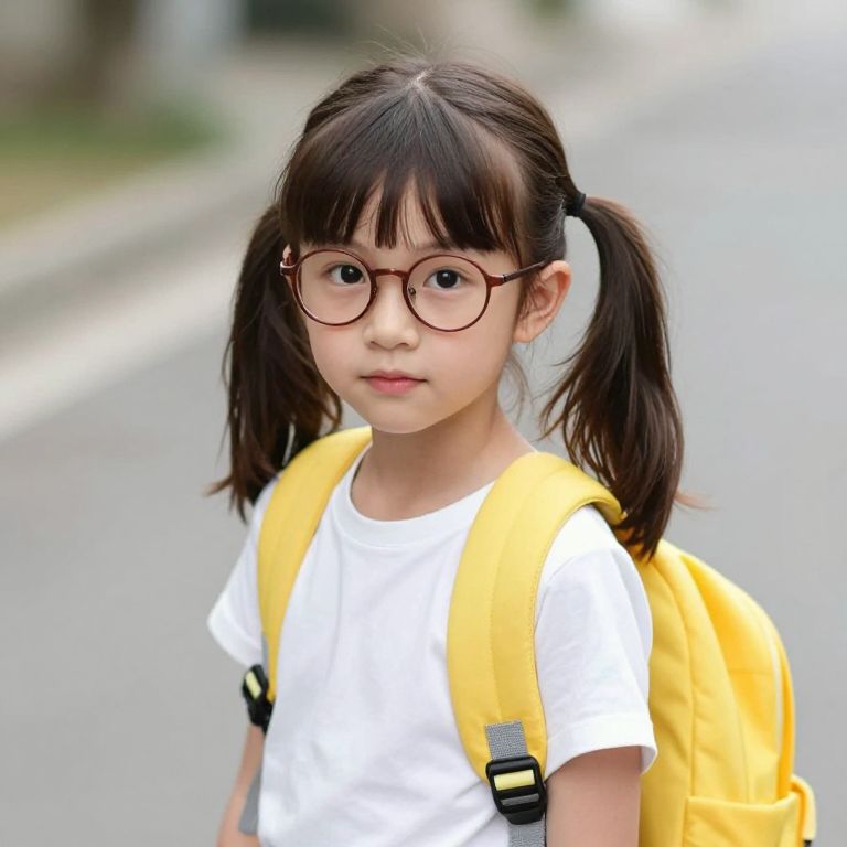 Photograph of an Asian girl with black pigtails, wearing round glasses, white shirt, and yellow backpack, standing on a blurred street.