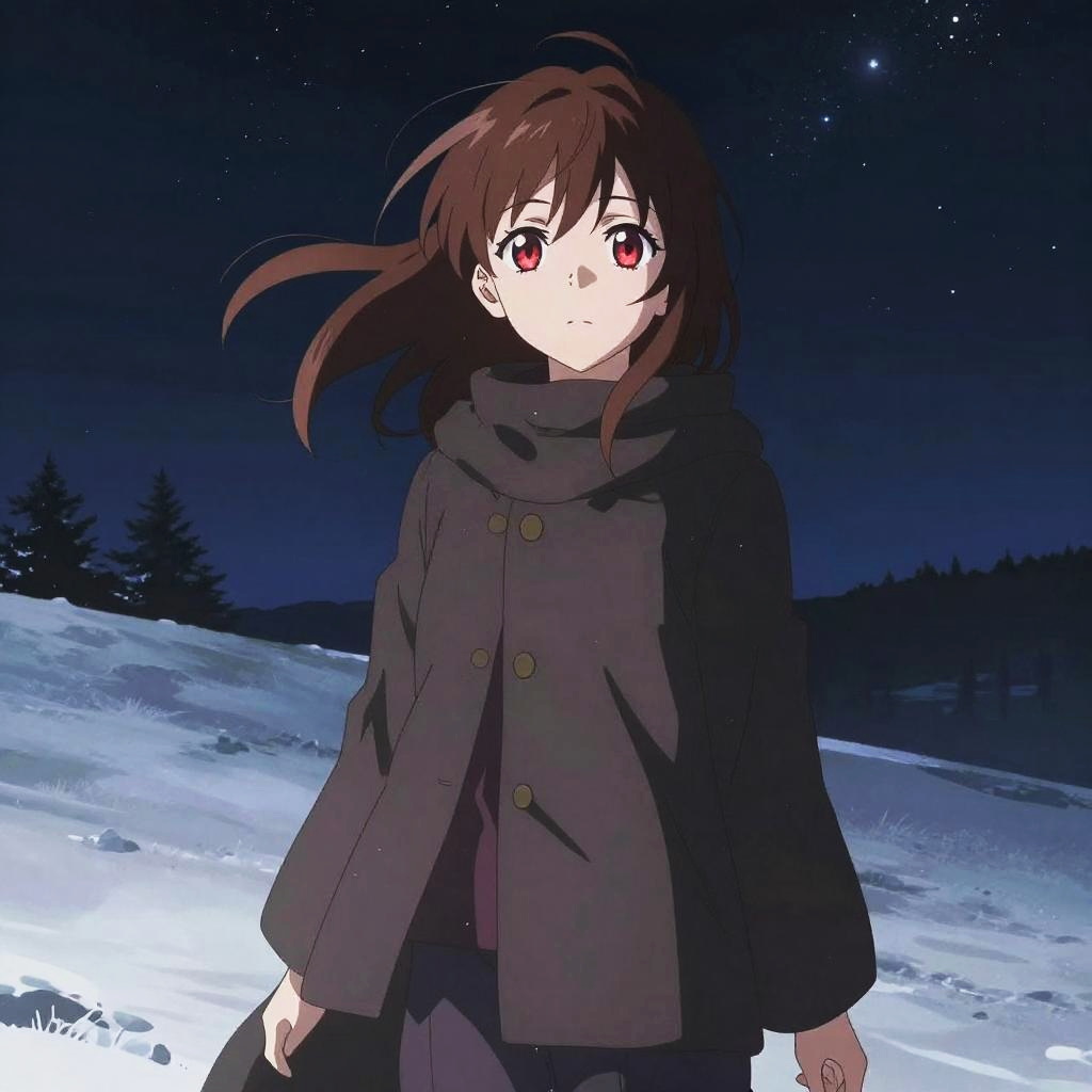 Anime girl with brown hair and red eyes standing on a snowy hill under starry night sky, soft wind blowing her hair and clothes, serene yet powerful expression, detailed anime art with cool tones and atmospheric lighting
