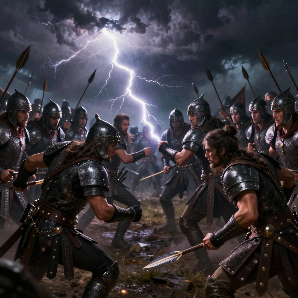 Conflitos depicted as a dramatic clash between two diverse armies under a stormy sky, lightning illuminating tense faces and flying arrows, in a dark fantasy art style with high detail and dynamic motion.