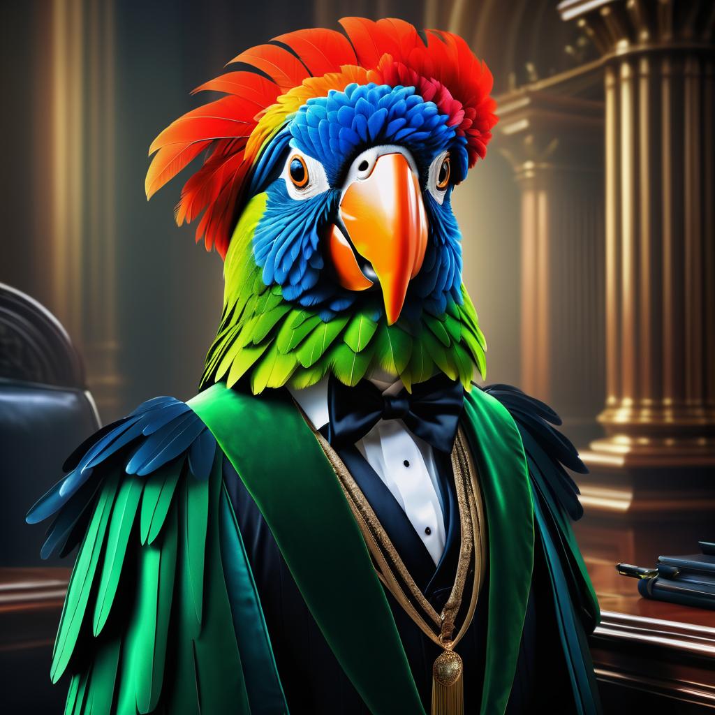 A highly detailed digital painting of a stern-looking parrot dressed as a judge, featuring vibrant blue, green, red, and yellow feathers. The parrot is wearing an elegant green velvet judge's robe with gold trim, a white shirt with vertical stripes, and a golden bow tie. The background includes sophisticated wooden furniture and warm lighting, enhancing the regal and formal atmosphere of the scene.