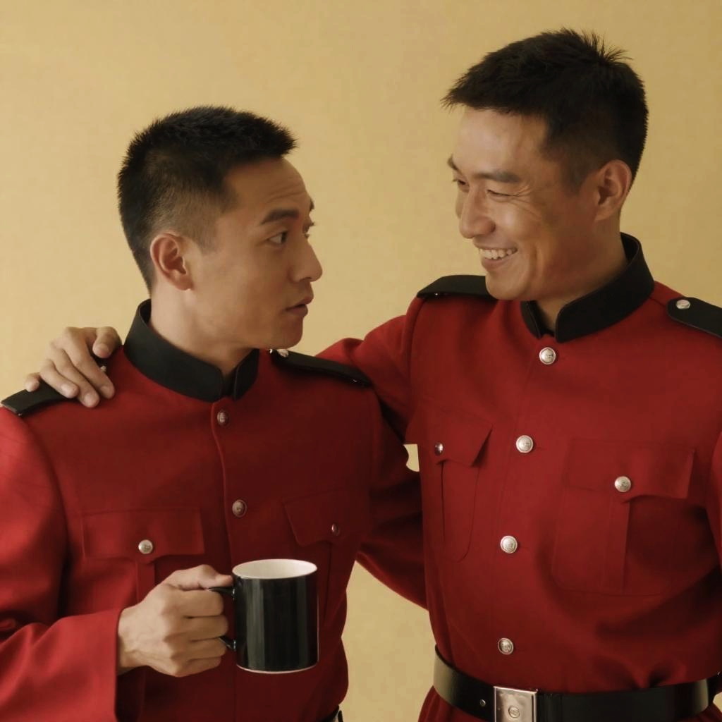 Two Asian men dressed in red military-style uniforms with black collars and silver buttons stand against a warm, yellow-lit background. The man on the left holds a black coffee mug and looks focused, while the man on the right smiles broadly with his arm around the other's shoulder, showcasing a friendly interaction.