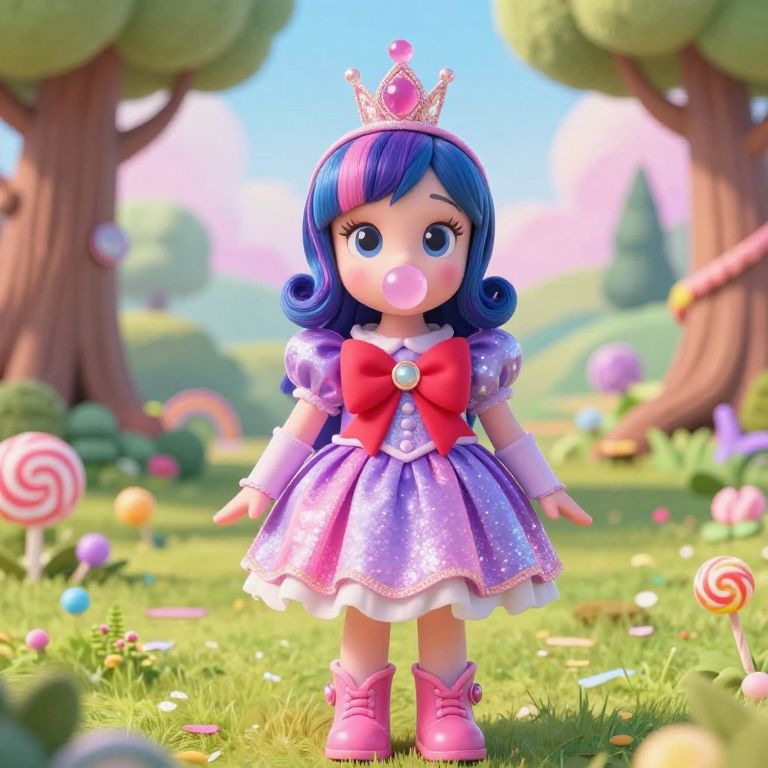 Digital CGI image of a cute, blue-haired doll princess with a sparkly purple dress, pink bow, crown, and bubble gum in a colorful,