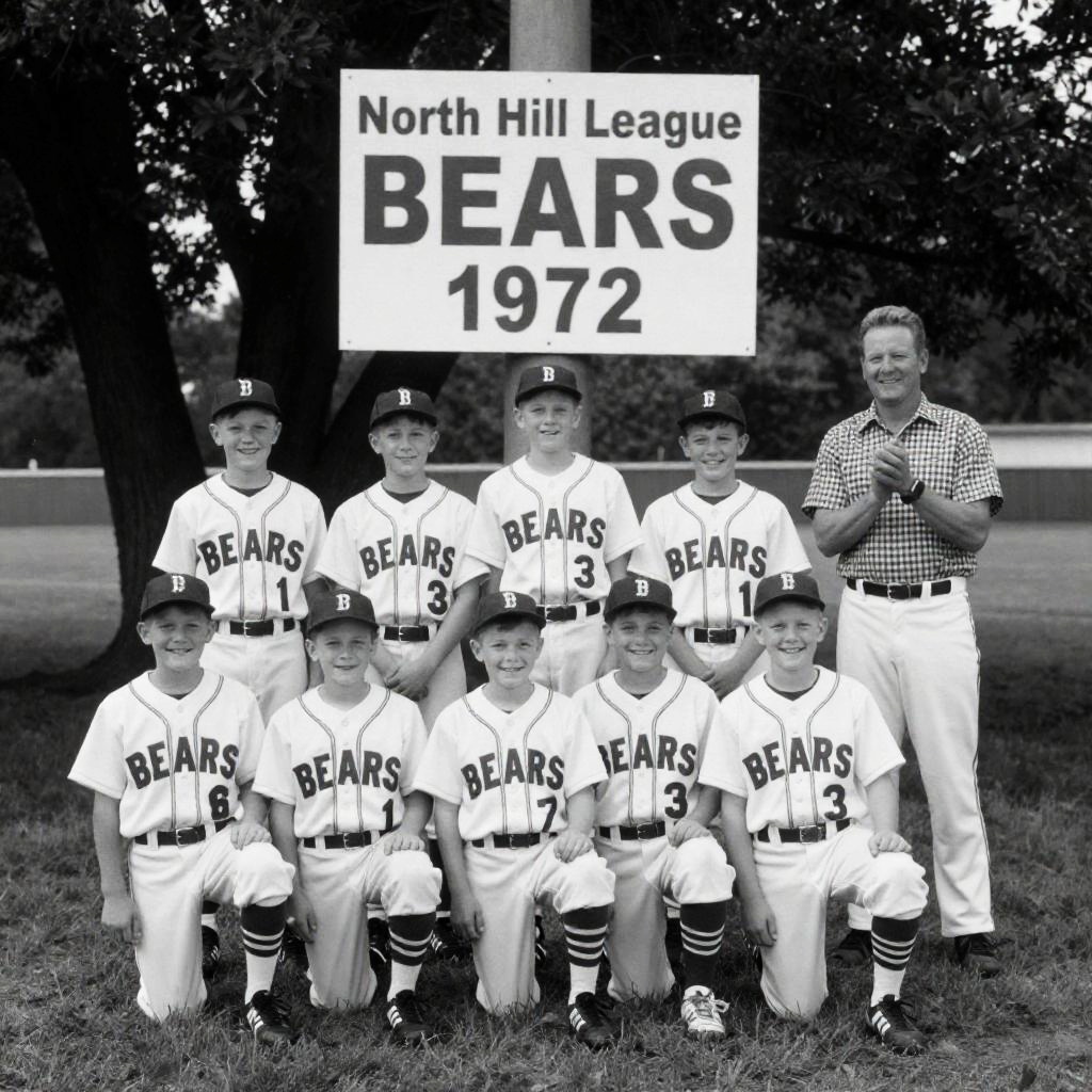 Black and white photograph of a baseball team from 1972. 12 boys in "BEARS" uniforms, 1 adult in checkered shirt. Kneeling and standing in front of trees, grassy field. Uniforms have numbers, caps. Sign in front reads "North Hill League BEARS 1972." Smiles, casual poses. Adult on right claps.