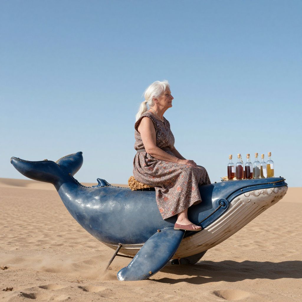 An old woman rides a mechanical whale across a desert sky, selling bottled echoes of lullabies once sung to long-lost children.