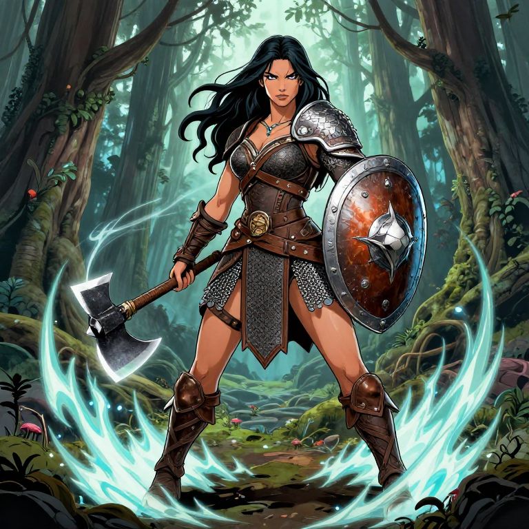 Digital artwork of a fierce warrior woman standing in a mystical forest. She has long black hair, tan skin, and a determined expression. She wears silver armor with chainmail, a brown leather belt, and brown boots. In her right hand, she holds a large, double-edged axe, and in her left, a round, silver-edged shield. Blue magical energy swirls around her feet. The background features towering trees with moss-covered trunks and a misty, ethereal light filtering through the forest canopy. The style is vibrant and dynamic, reminiscent of comic book art.