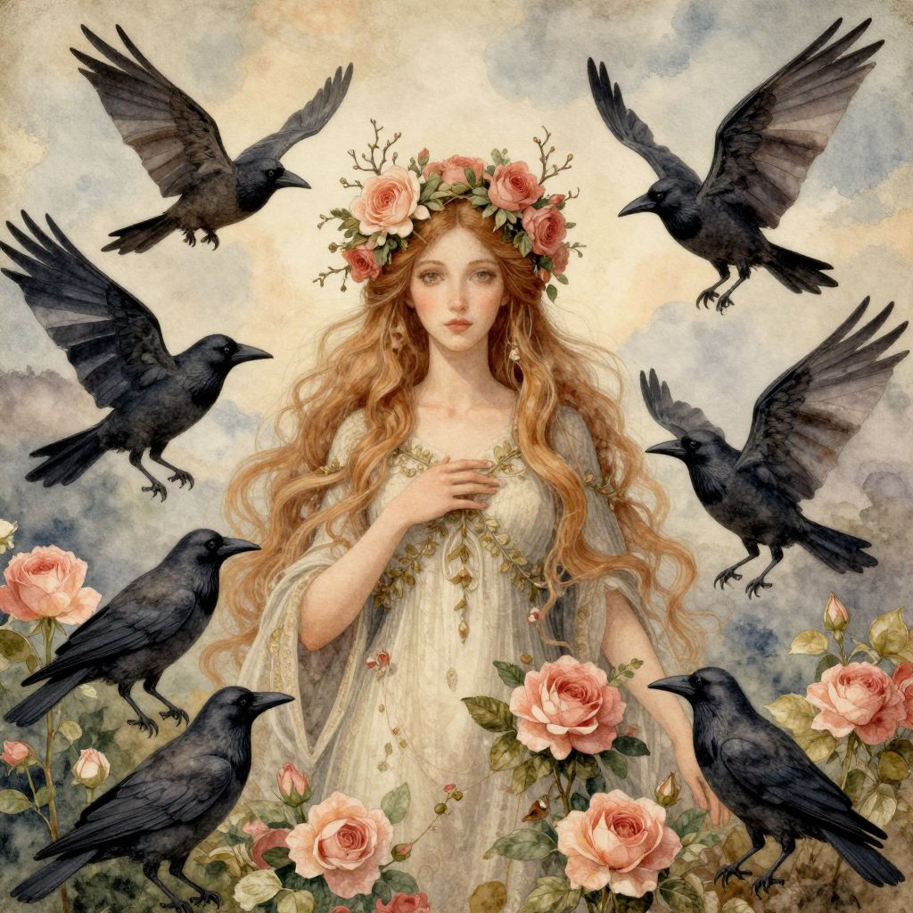 Digital painting of a fair-skinned woman with orange-feathered birds surrounding her, wearing an ornate, flowing gown, against a dark blue background