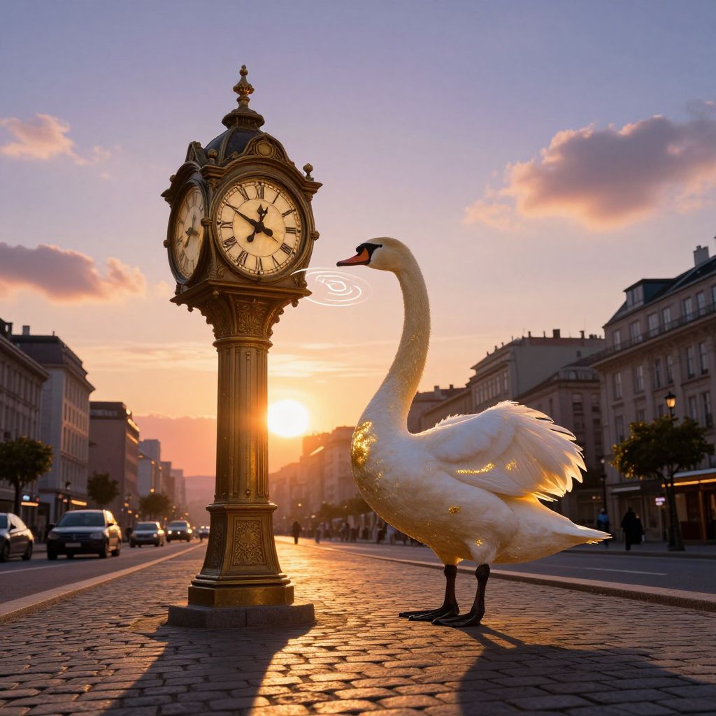 An enchanting scene unfolds, reminiscent of surrealism's whimsical essence, depicting an elegant swan poised atop a towering clock structure within the vibrant tapestry of a cityscape during golden hour. The swan's resplendent plumage glistens like liquid gold under the fading sunlight, as one leg extends to gently graze the surface of the colossal timepiece. This interaction sends ripples of temporal distortion radiating from the point of contact. As twilight descends upon the bustling metropolis, a spectrum of warm hues casts elongated shadows across the cobblestone pathways, bathing this fantastical encounter in an alluring and melancholic glow that captures the fleeting essence of the moment within a dreamlike composition.