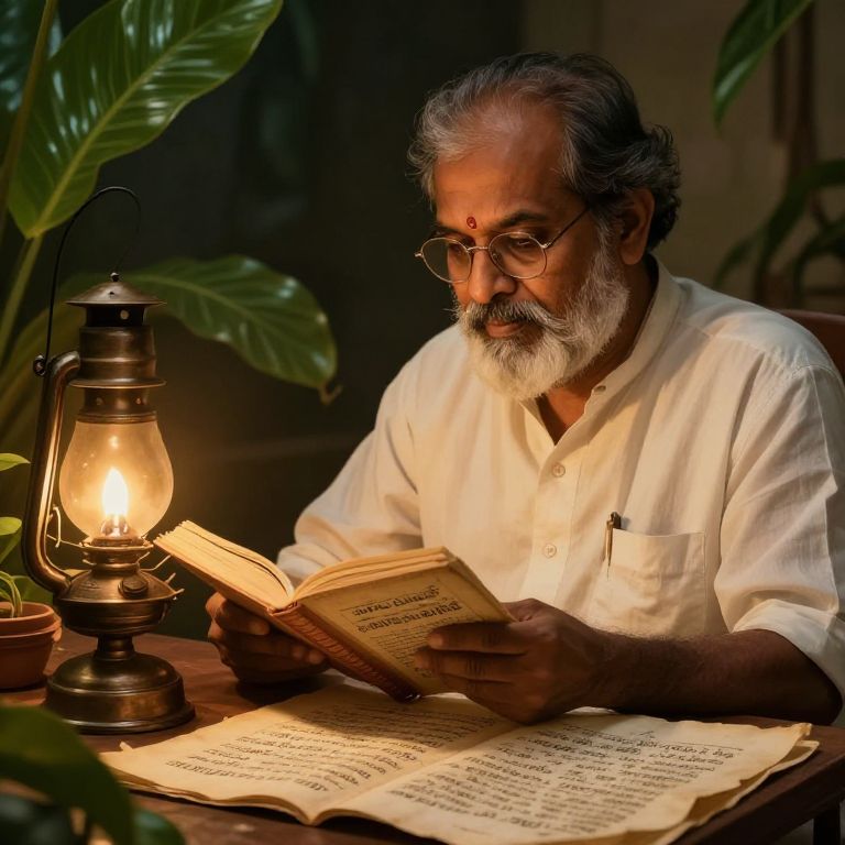 Prompt Tamil: A detailed illustration of a Tamil scholar reading ancient Tamil manuscripts under a vintage oil lamp, surrounded by botanical elements and handwritten Tamil verses, realistic textures and warm ambient light.