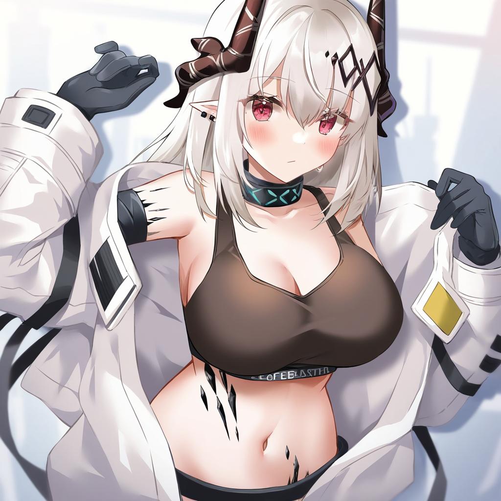 Mudrock (elite ii) (arknights), arknights, 1girl, pointy ears, horns, ear piercing, red eyes, hair between eyes, long hair, white hair, grey hair, hair ornament, large breasts, cleavage, navel, black sports bra, black gloves, bare shoulders, off shoulder, long sleeves, black choker, oripathy lesion (arknights), material growth, infection monitor (arknights), crop top, midriff, stomach, by artist shiro kuma shake, leet