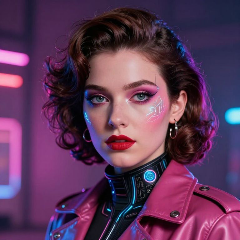 This is a highly detailed, digitally-rendered portrait of a fair-skinned woman with short, wavy brown hair, styled in a retro 1950s fashion. She has striking blue eyes, bold pink and blue eye shadow, and vibrant red lipstick. Her face features a glowing, neon pink and blue lightning bolt design on her left cheek. She wears a glossy, red leather jacket over a high-neck black top with blue neon accents. Her hoop earrings are small and silver. The background is a blurred, neon-lit urban scene with pink and blue lights, creating a futuristic, cyberpunk atmosphere. The image combines elements of retro and futuristic styles.
