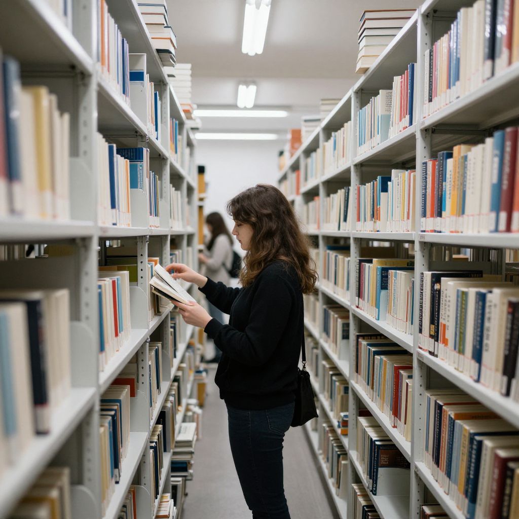 Photograph of a young woman with curly brown hair, wearing a black blouse and jeans, browsing books in a brightly lit, narrow library aisle with tall