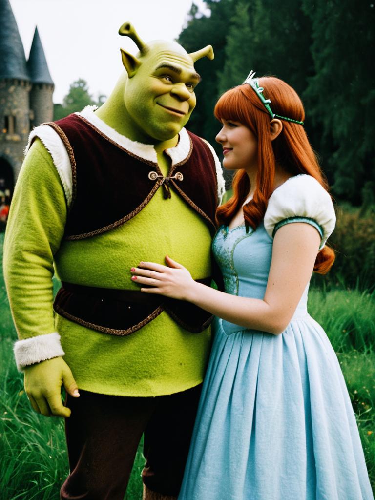 Couple in Shrek and Fiona Costume, cinematic realism, fairy tale cosplay photo