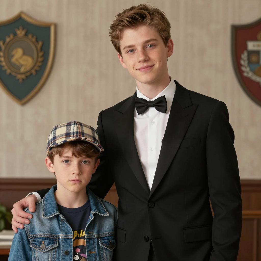 Four people standing in front of a dark blue SUV at night. Woman with curly blonde hair in beige coat, pink top, holding a young girl with brown hair in red jacket and blue hat. Two boys, one in blue jacket with white fur trim, red shirt, other in gold jacket, black vest, red shirt. Background with blurred lights. People stand close together, looking ahead.