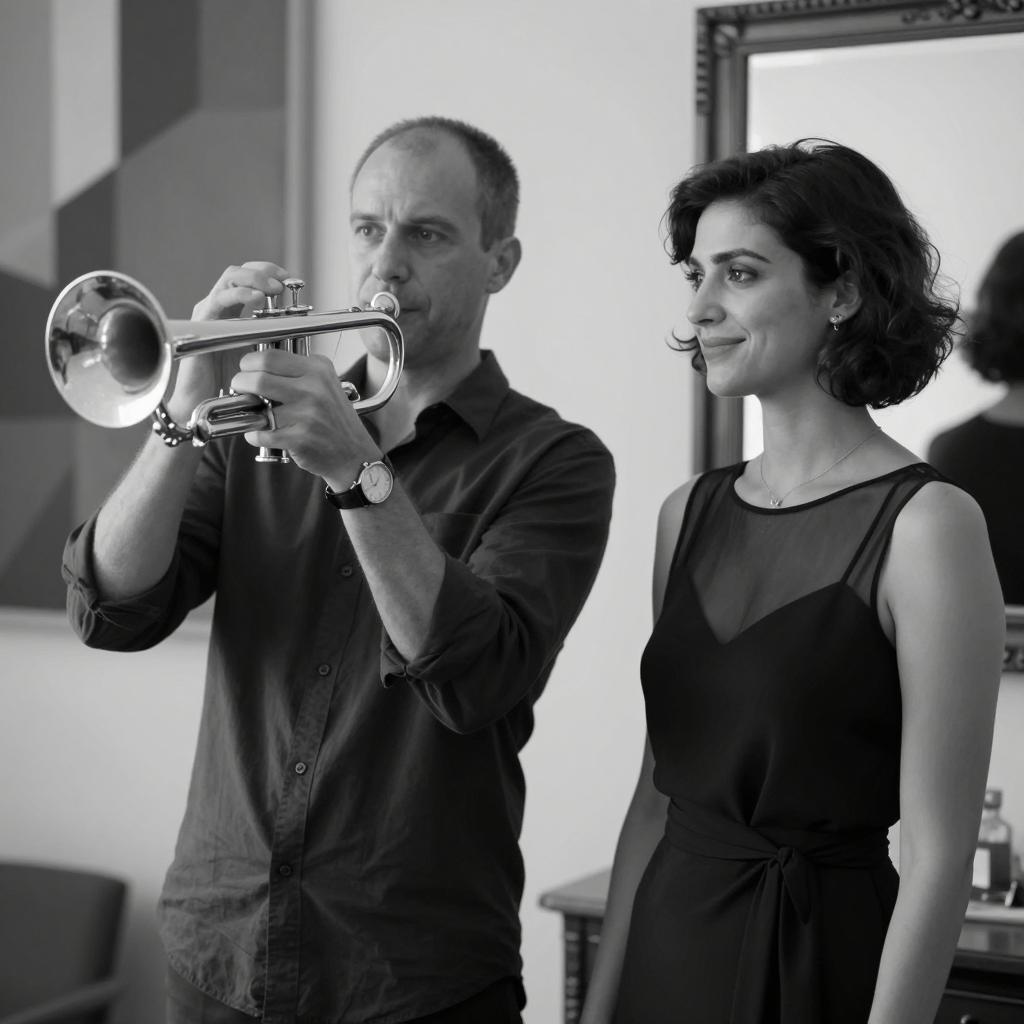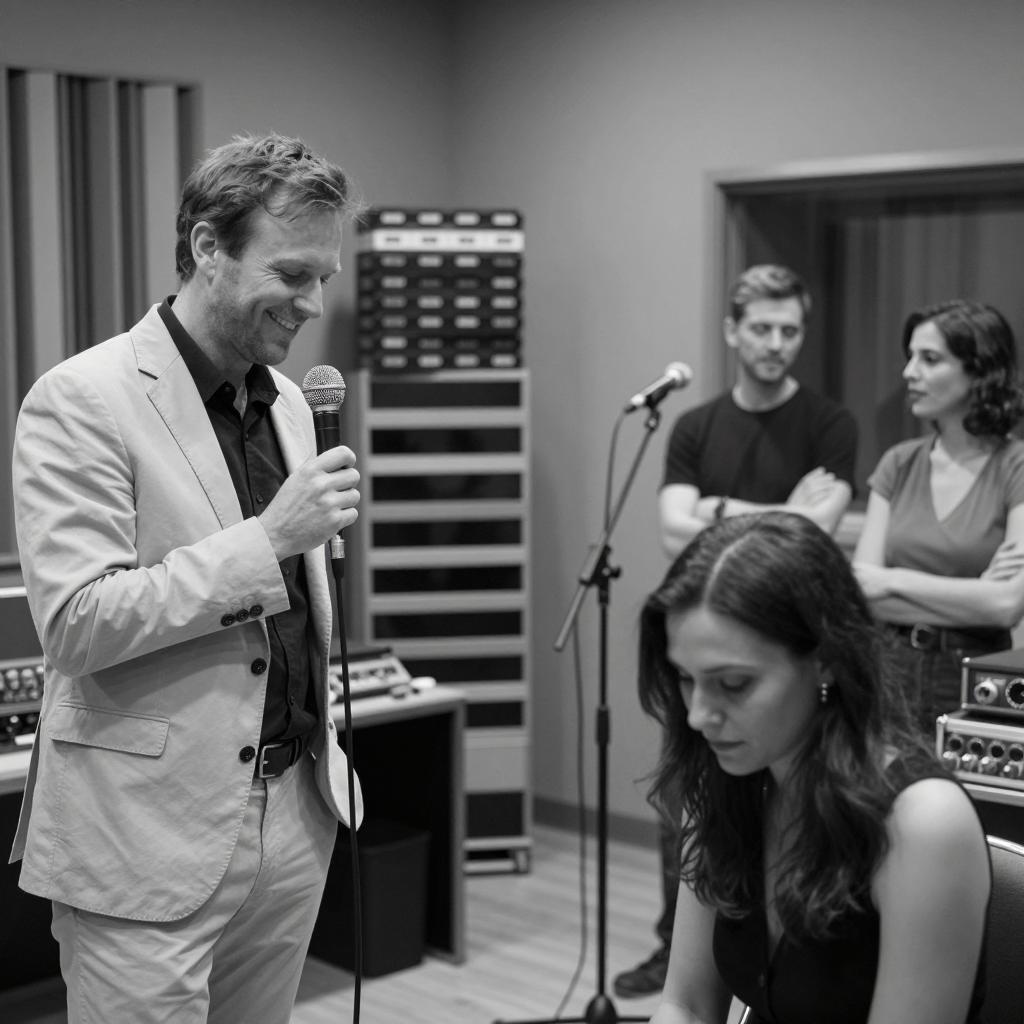 Black and white photograph of a recording studio. Man in light suit, holding a microphone, smiling, left. Woman with dark hair, seated, looking down, right. Background: stacked record boxes, framed sign, another man and woman standing, talking. Microphone stand, recording equipment.