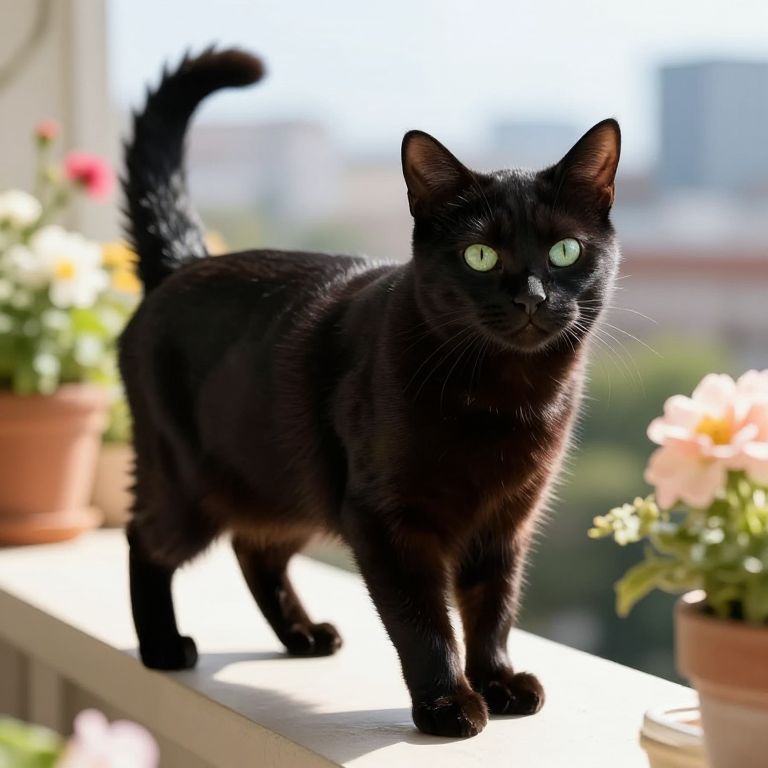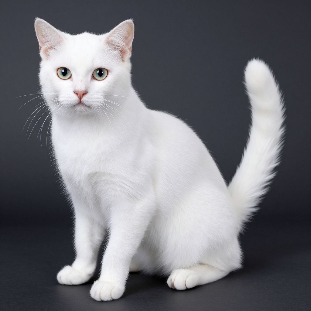 Photograph of a small, black, short-haired kitten standing on a white background. The kitten has bright, round green eyes, large, pointed ears, and a fluffy, slightly curved tail. Its fur appears smooth and shiny, with a slightly glossy texture. The kitten's expression is curious and attentive, with its head slightly tilted and whiskers visible. The white background provides a stark contrast, making the kitten's black fur stand out prominently. The overall composition is simple and focuses solely on the kitten, highlighting its youthful and playful appearance.